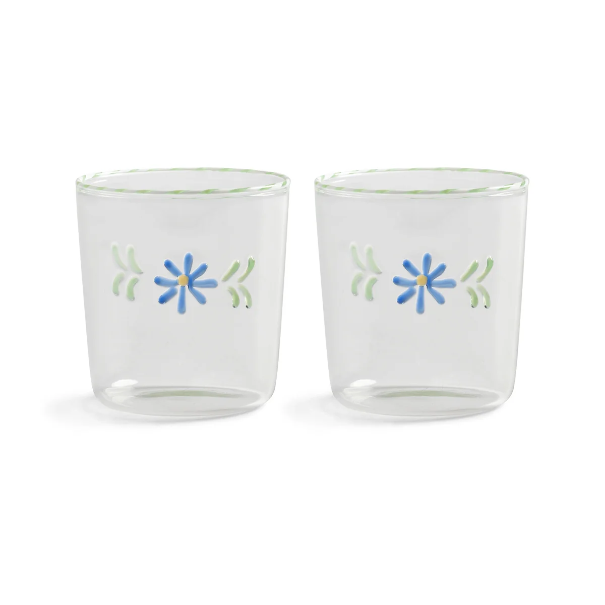 De Flora drinkglazen van & klevering combineren robuust borosilicaatglas met Scandinavisch geïnspireerde folkpatronen. Elk glas is met de hand versierd met liefdevol geplaatste bloemen en bladeren en maakt indruk met een unieke twist - twee kleuren smelten samen aan de rand om een harmonieus totaalbeeld te creëren. De set van twee glazen combineert functionaliteit met een opvallend ontwerp en wordt geleverd in de typische & k doos, waardoor het een elegante blikvanger is op elke tafel.