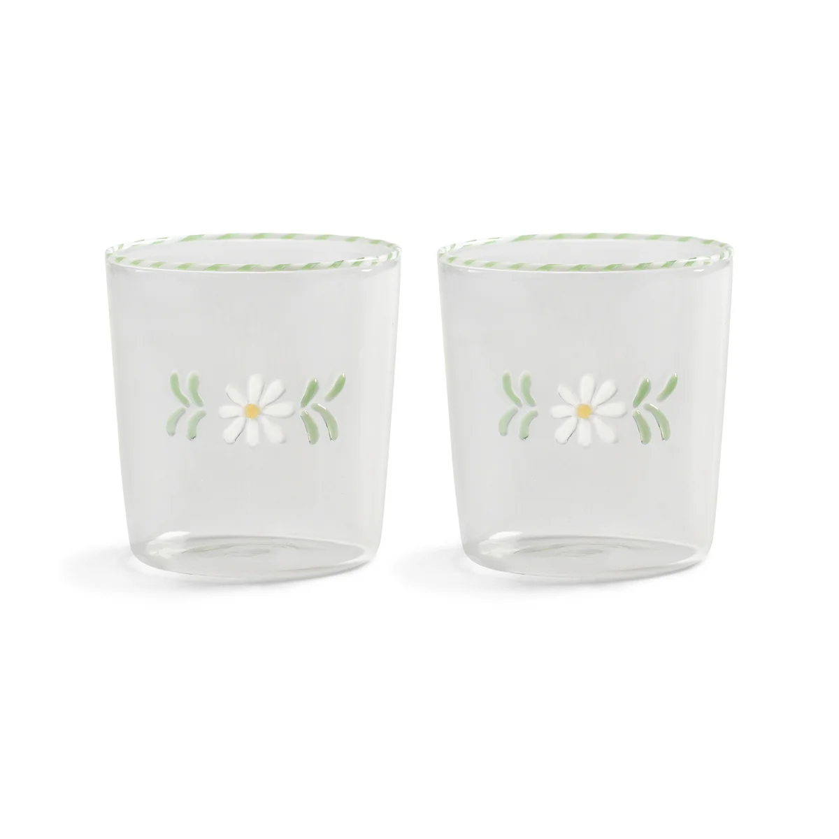 De Flora drinkglazen van & klevering combineren robuust borosilicaatglas met Scandinavisch geïnspireerde folkpatronen. Elk glas is met de hand versierd met liefdevol geplaatste bloemen en bladeren en maakt indruk met een unieke twist - twee kleuren smelten samen aan de rand om een harmonieus totaalbeeld te creëren. De set van twee glazen combineert functionaliteit met een opvallend ontwerp en wordt geleverd in de typische & k doos, waardoor het een elegante blikvanger is op elke tafel.