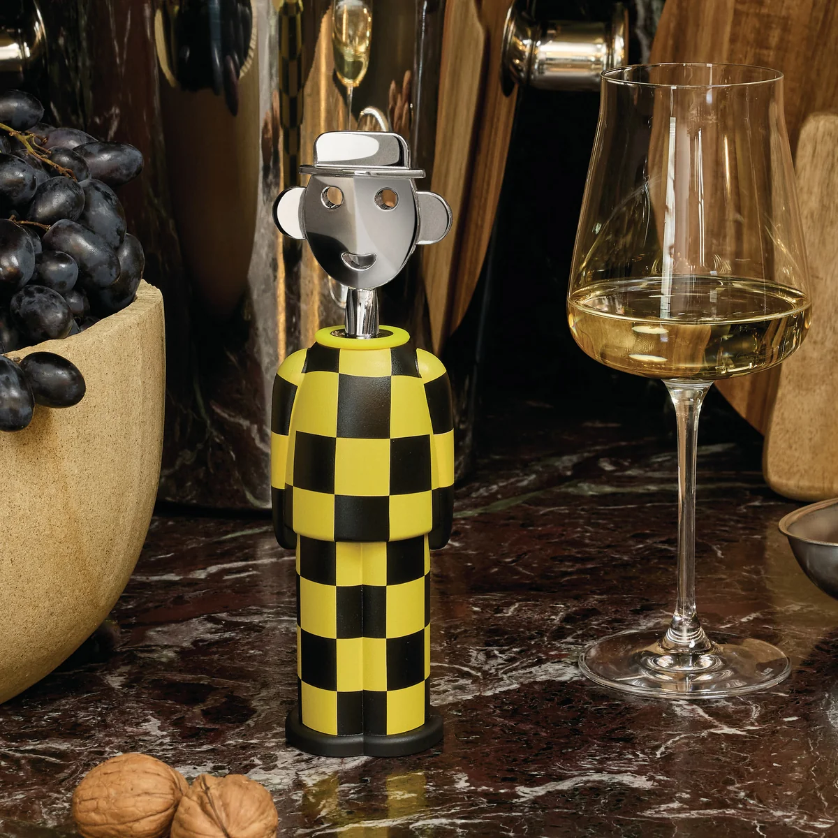 Misschien was het uit jaloezie op het grote succes van "Anna G." dat Alessandro M endini besloot ons te verblijden met de figuur " Alessandro M .". Zoals ongetwijfeld gemakkelijk te herkennen is, is deze kurkentrekker het zelfportret van de ontwerper. Hoewel het er misschien gemakkelijk uitziet, was het in werkelijkheid allesbehalve gemakkelijk om een nieuw personage te creëren dat zowel in de autobiografische gebeurtenissen van de ontwerper als in de internationale designscène kon passen.