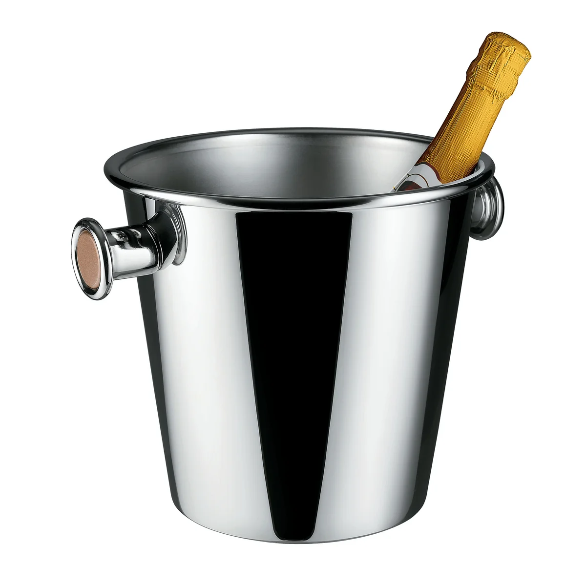 De wijnkoeler met handgrepen van Ettore Sottsass en Alberto Gozzi for Alessi is een elegante en tijdloze roestvrijstalen koeler voor Bordeaux, Bourgogne en Champagne flessen. Speciaal ontworpen voor specifieke flesvormen, koelt de koeler de flessen tot aan de hals.