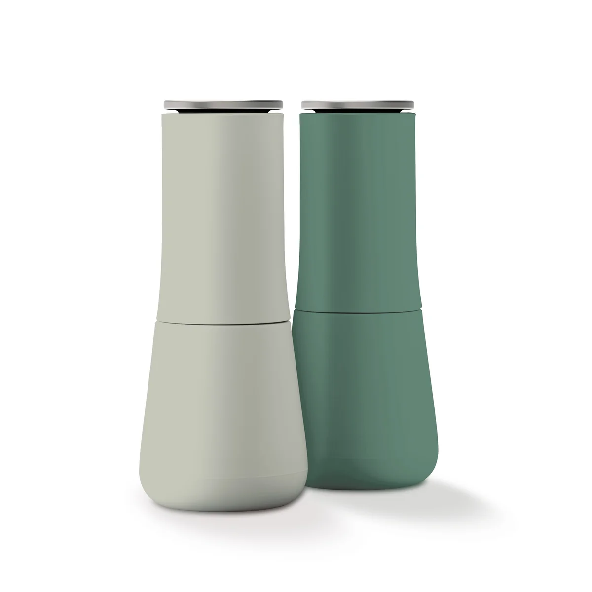 De slijpmachines zijn gemaakt van plastic. De molen is gemaakt van keramiek en de molen is gemakkelijk te vullen, dankzij een grote opening aan de onderkant. Om te malen, draai je de molen gewoon om en draai je aan de basis. De maalsterkte kan worden aangepast door aan het roestvrijstalen deksel te draaien.