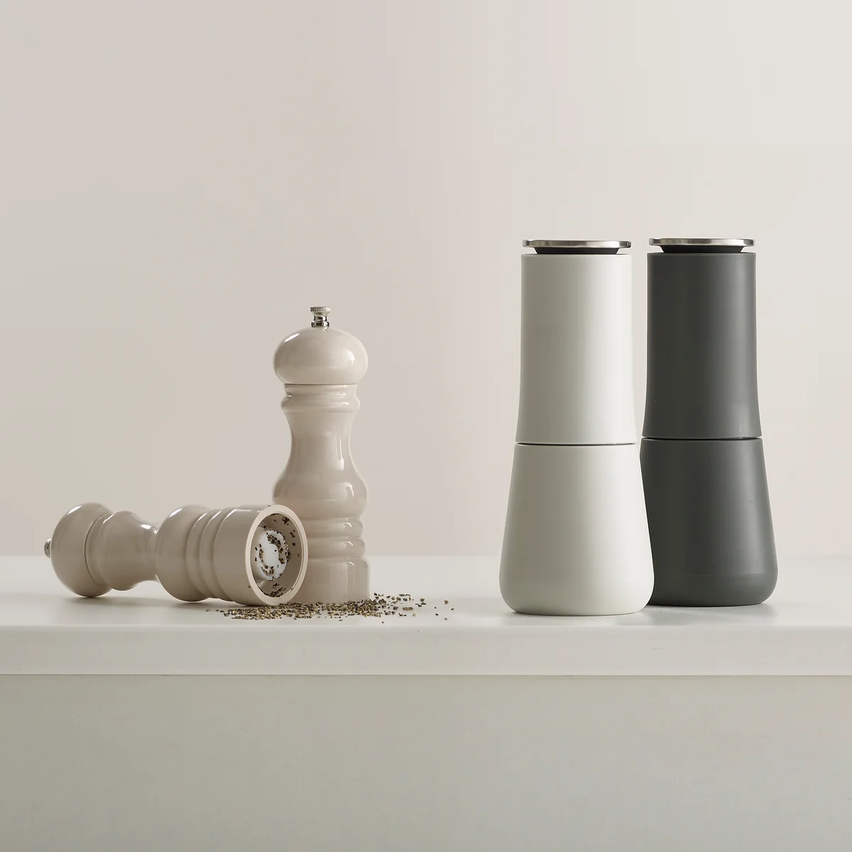 Visueel verschillen de twee molens in kleur. De zoutmolen is lichtgrijs en de pepermolen is donkergrijs.