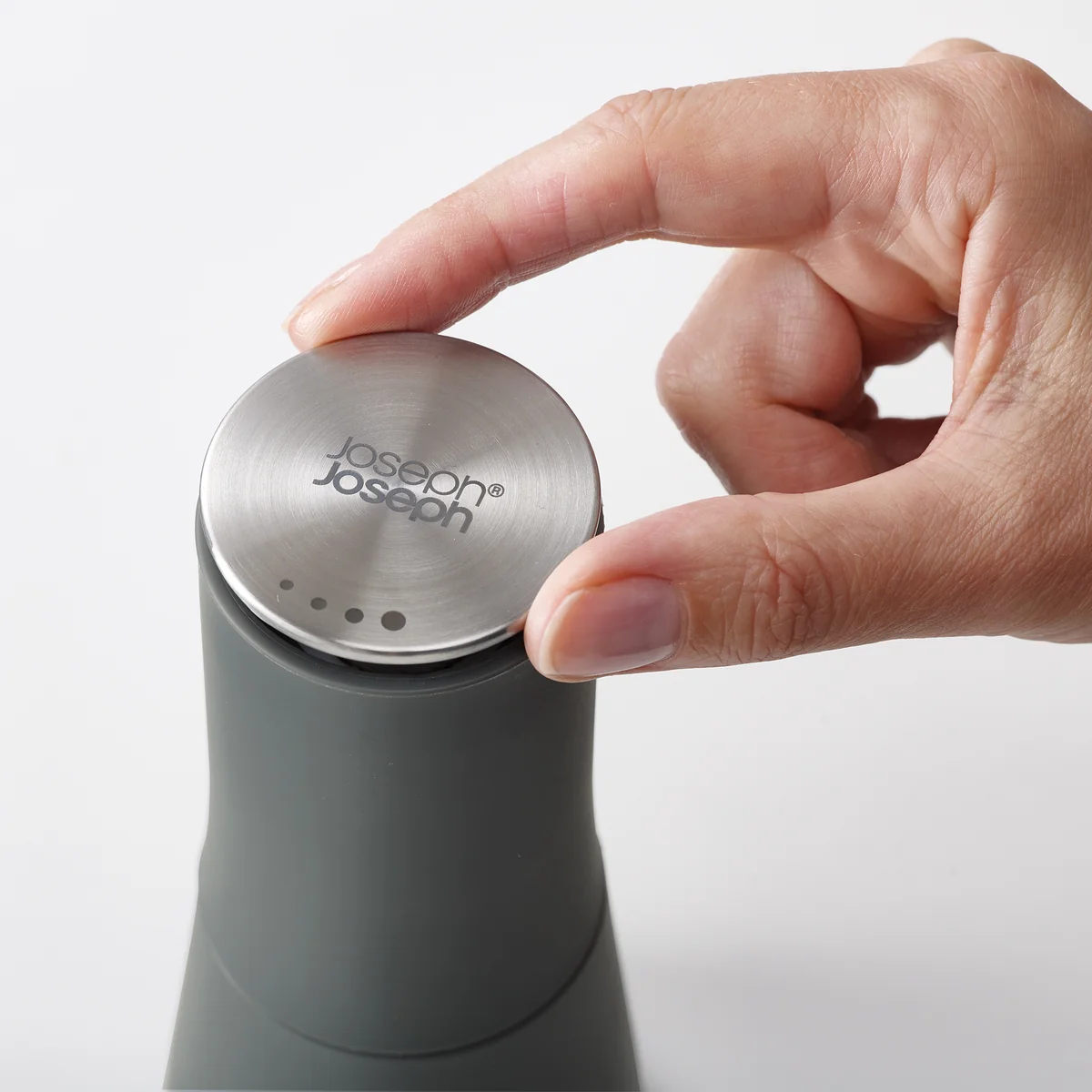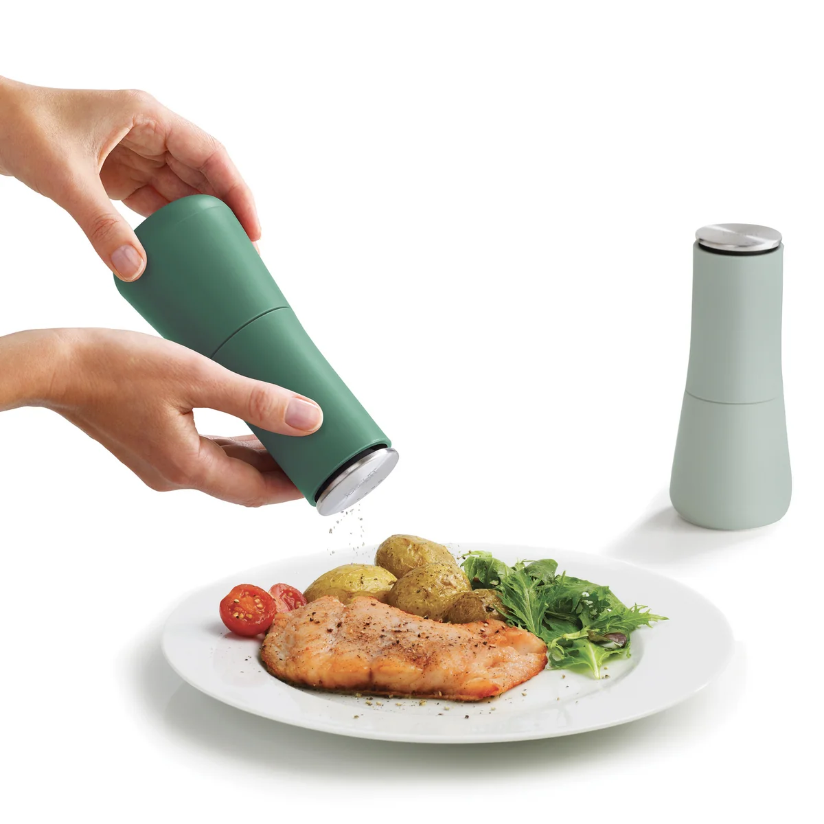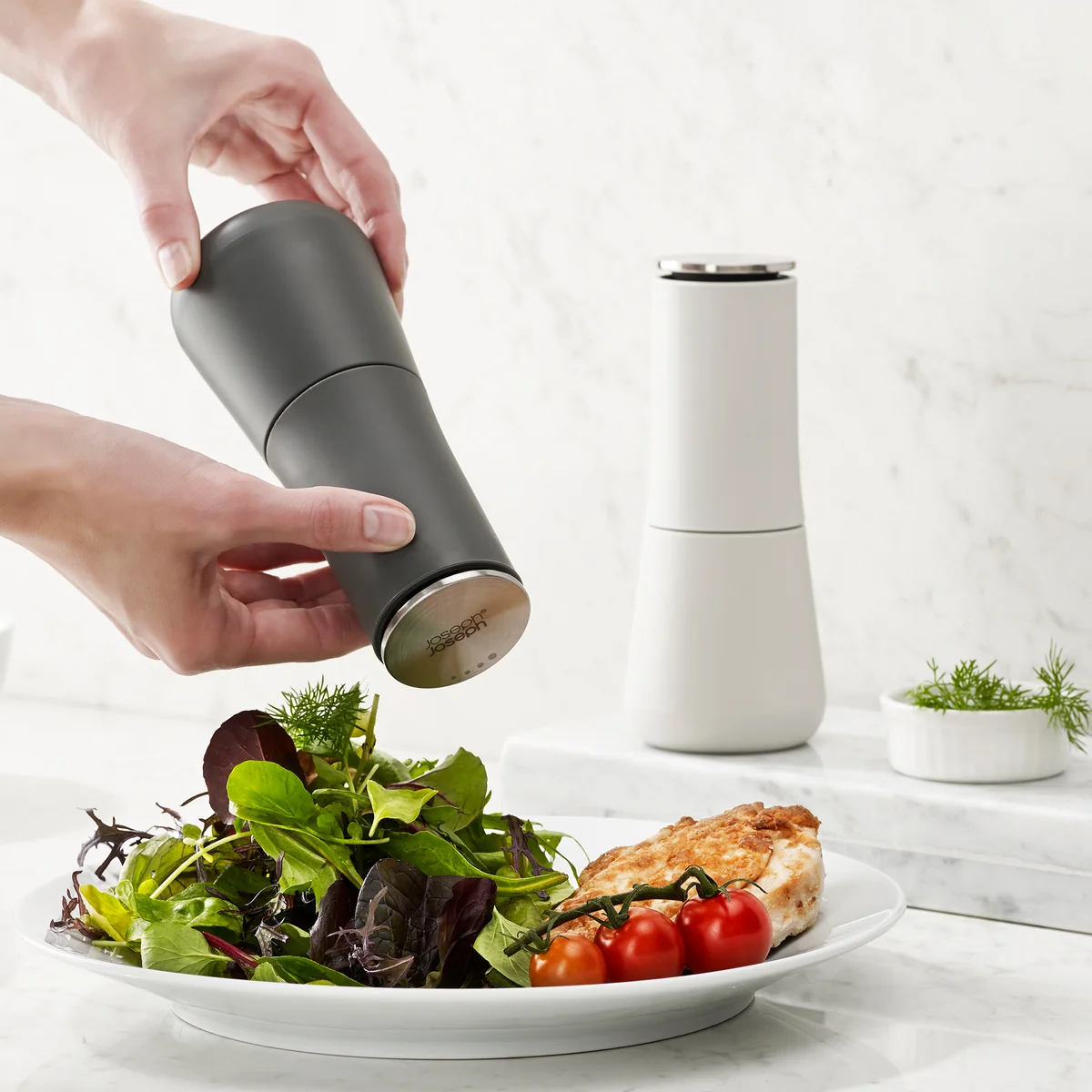 De Milltop Het peper- en zoutmolenset van Joseph Joseph is innovatief en praktisch. Andere zout- en pepermolens laten vaak resten achter wanneer ze worden neergezet, maar overtollig gemalen materiaal valt na gebruik terug in de molens. Milltop molens. De truc: de molen bevindt zich bovenin de molen. Het omgekeerde ontwerp voorkomt kruimels op het aanrecht en de eettafel.