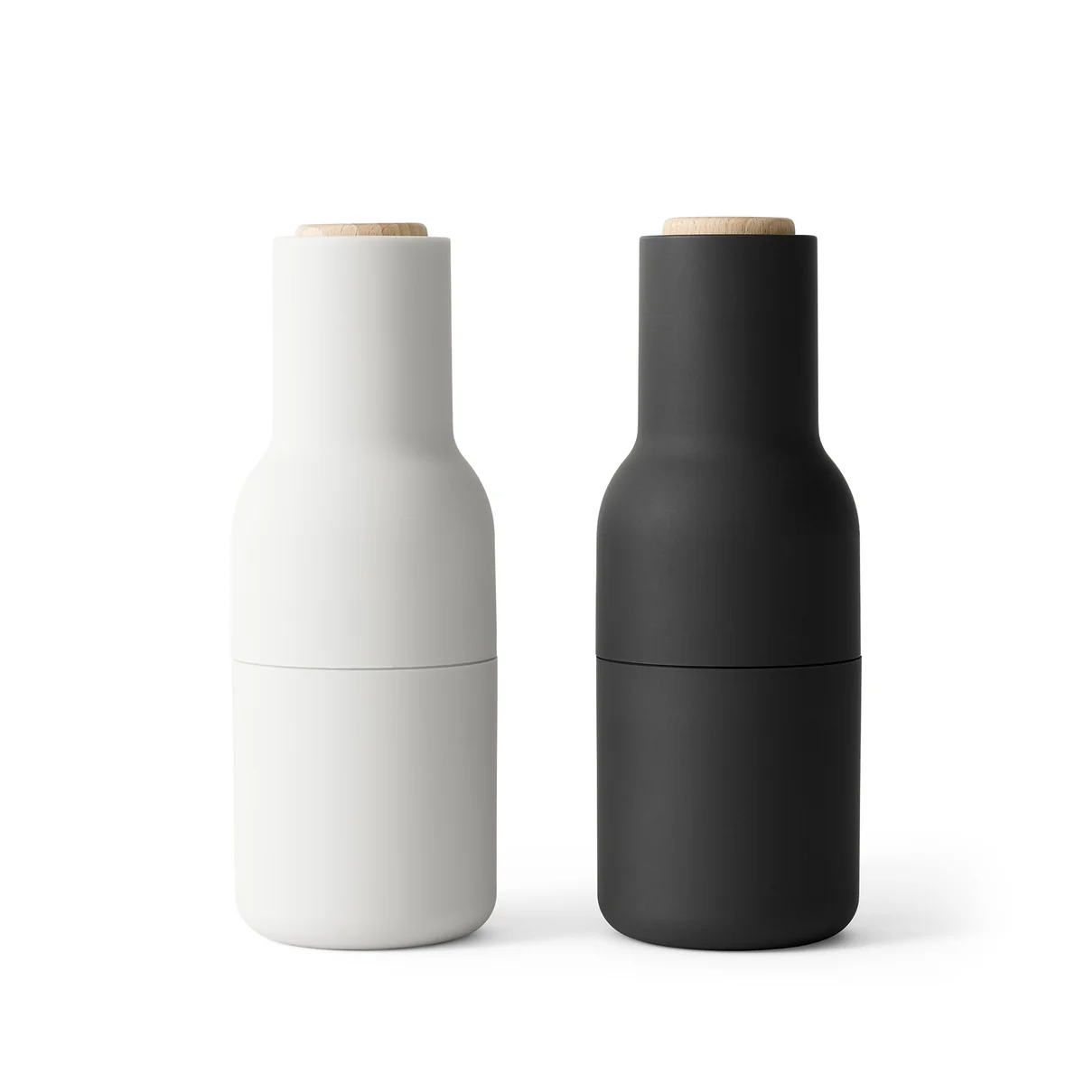 Het materiaal voor de Bottle Grinder De ontwerpers van Norm en Audo ABS-kunststof met een rubberen coating. De molen heeft een duurzaam, krachtig keramisch maalmechanisme dat zout en peper betrouwbaar maalt.
