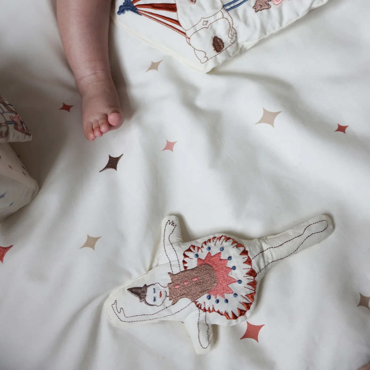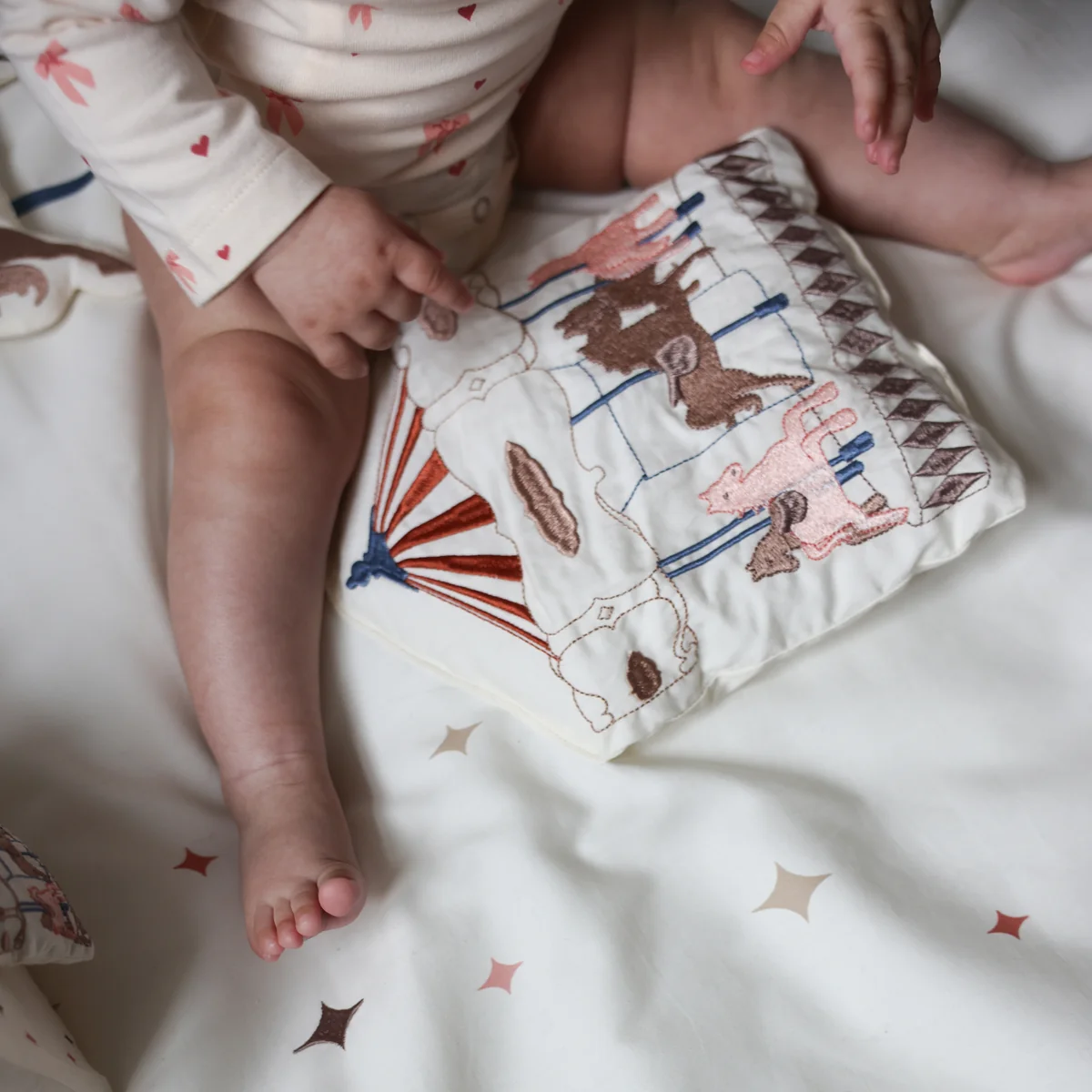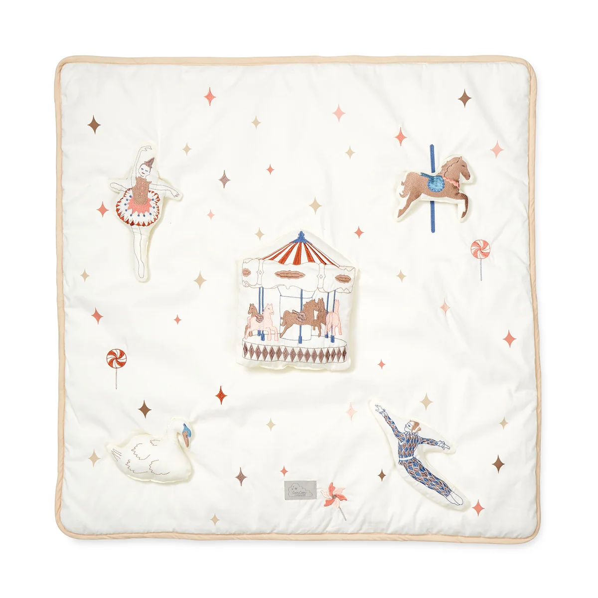 De geïntegreerde speeltjes en texturen stimuleren de zintuigen terwijl de baby op de zachte mat ligt of speelt. Het speelse ontwerp, gecombineerd met liefdevol vervaardigde details, creëert een stimulerende omgeving die de ontwikkeling van motorische vaardigheden en visuele waarneming bevordert.