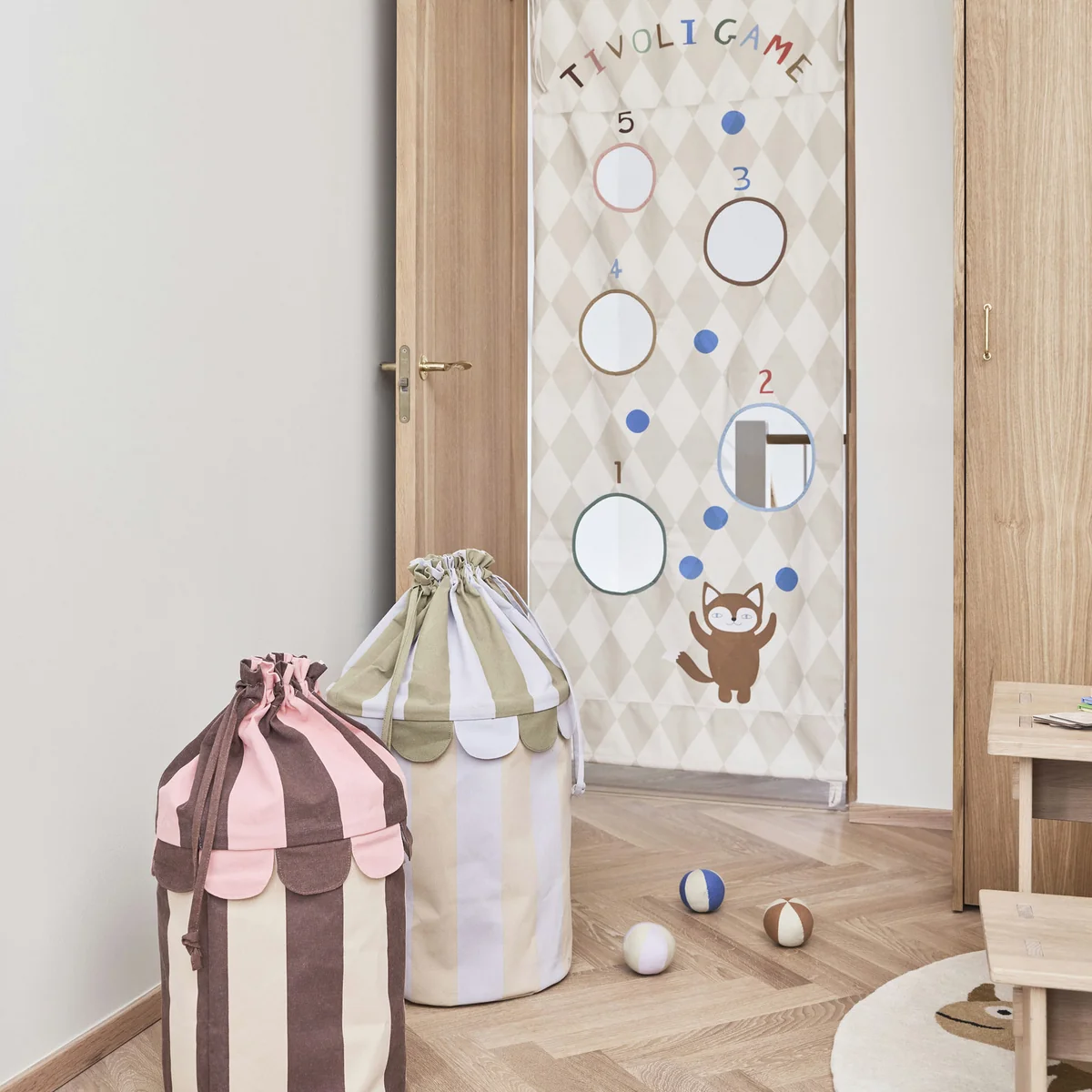 De Tivoli deurmat verandert een deurkozijn in een handomdraai in een creatieve speelplek. Gemaakt van 100% katoenen stof, biedt het een stabiele maar flexibele achtergrond voor rollenspel, retraites of kleine theatermomenten. Het speelse ontwerp met raamopening stimuleert de verbeelding en creëert een kamer in een kamer - ideaal voor kinderkamers of woonkamers. De eenvoudige bevestiging zorgt voor een snelle montage en demontage.