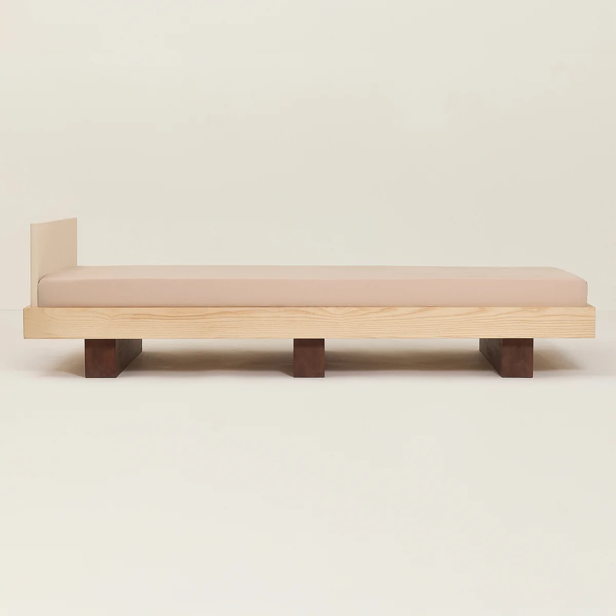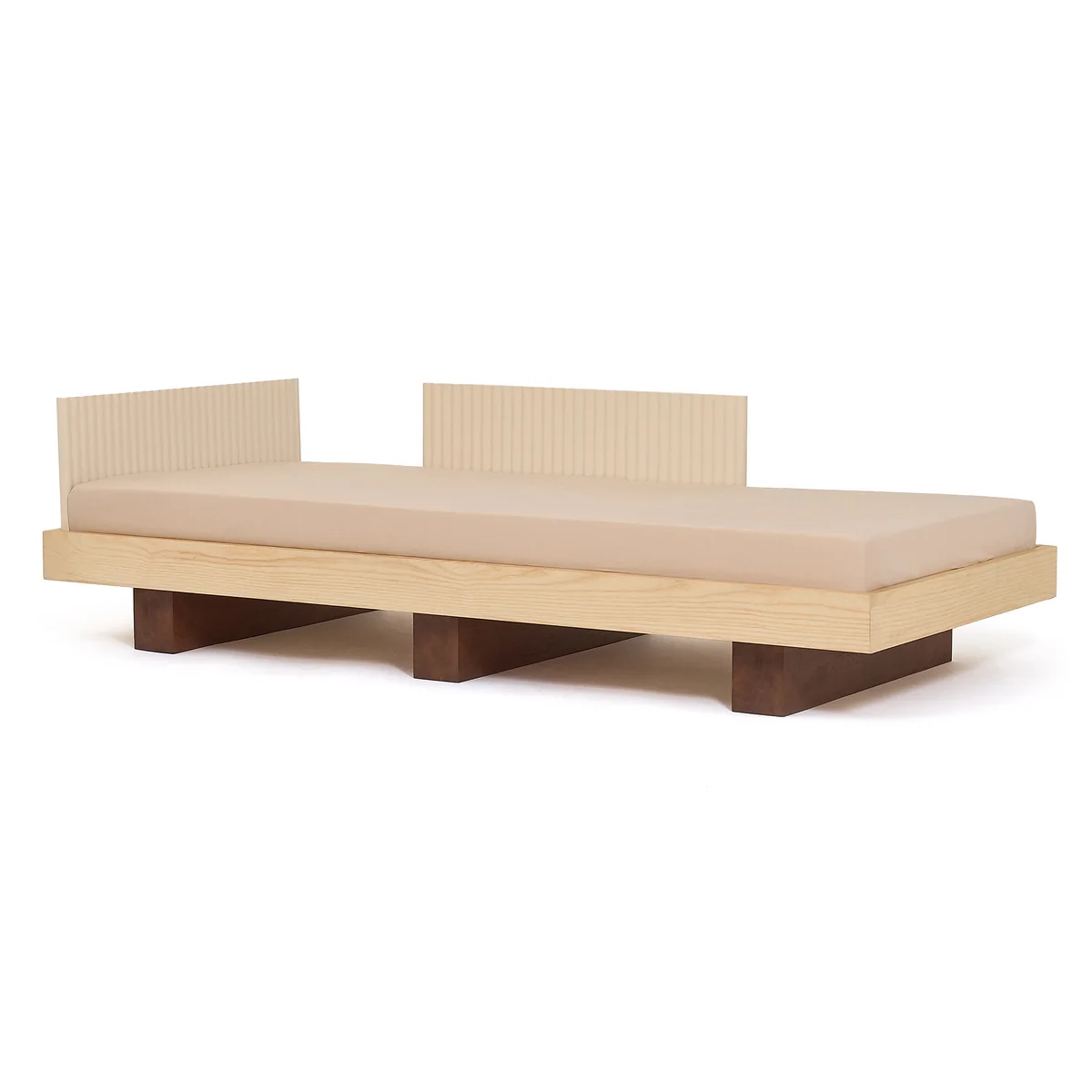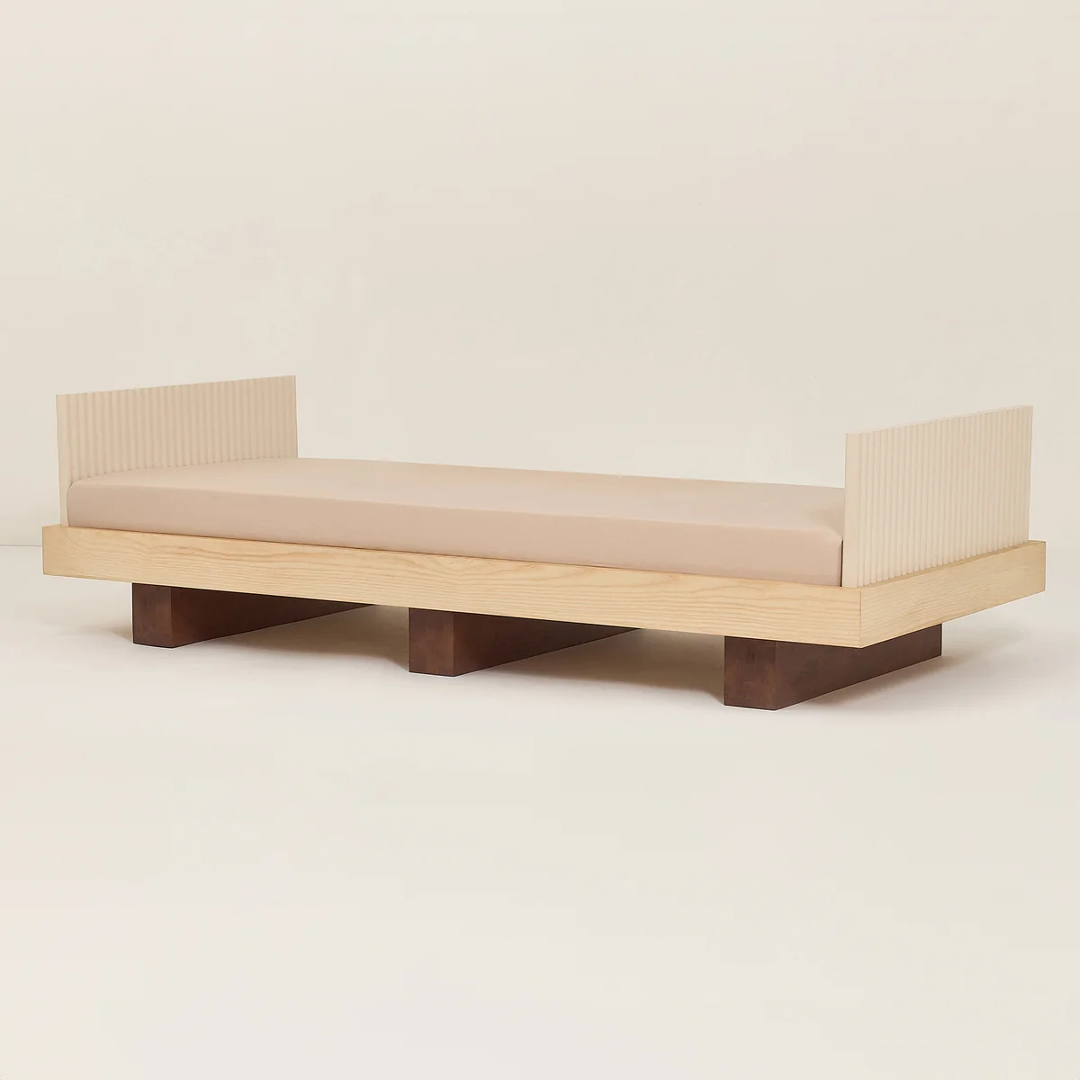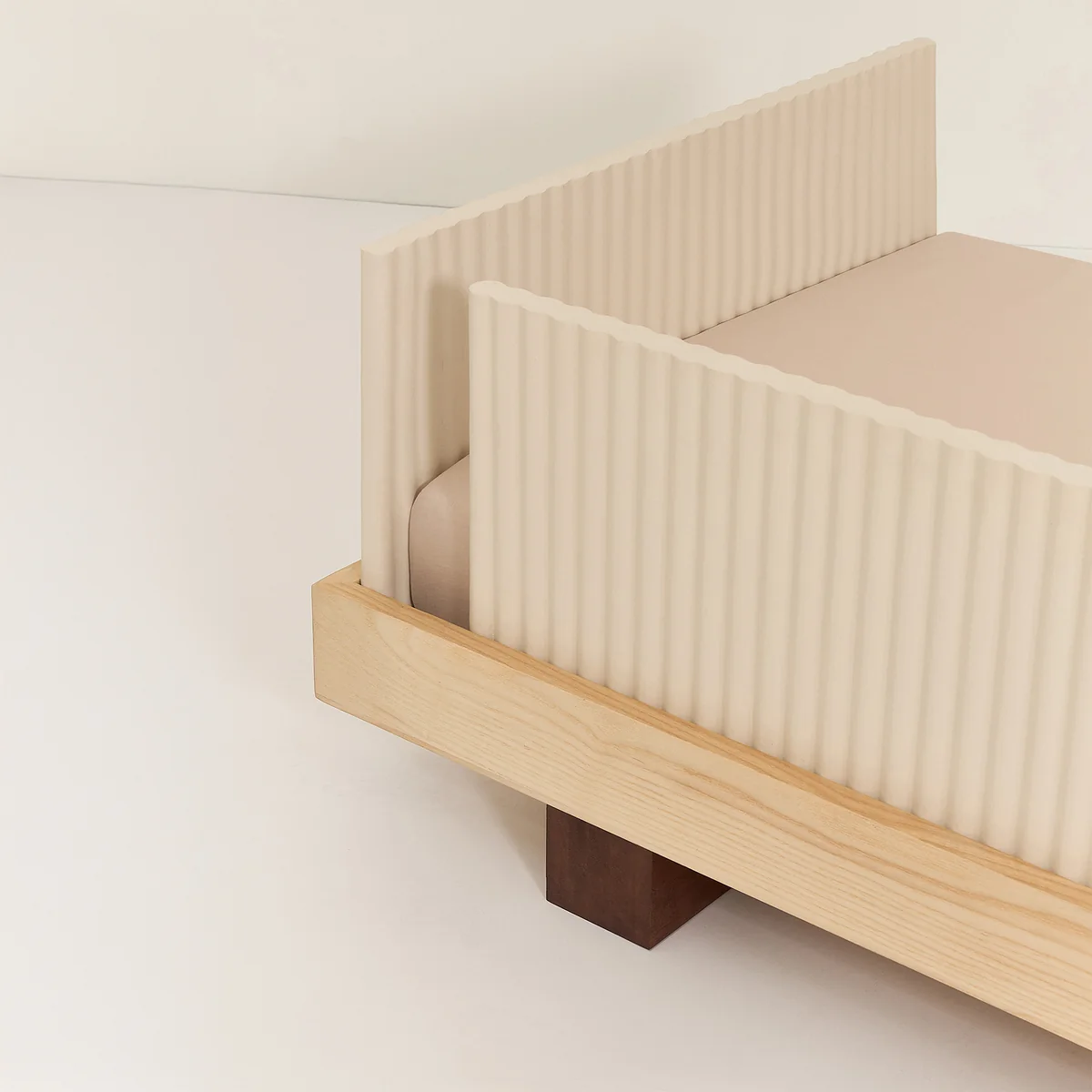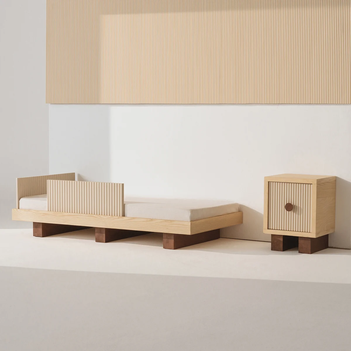De opvallende bedpoten, geïnspireerd op traditionele Japanse geta sandalen, geven het ontwerp een elegante eenvoud met een culturele verwijzing. Zijpanelen met fijne groeven creëren een spannend spel van licht en schaduw en nodigen kinderen uit om de structuur met hun vingers te verkennen - een harmonieuze combinatie van esthetiek en gevoel.
