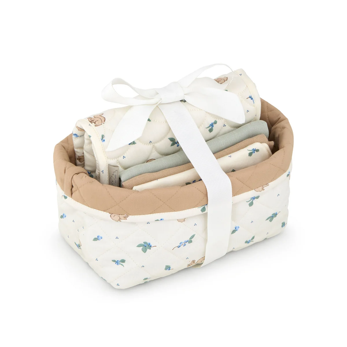 De perfecte cadeauset voor nieuwe ouders: Deze liefdevol samengestelde Baby Care set combineert onze favoriete benodigdheden van 100% biologisch katoen. Hij bevat een gewatteerde opbergmand (de grootste uit de set van twee), ideaal voor alles wat je bij de verschoontafel bij de hand wilt hebben. Er zijn ook twee zachte slabbetjes, een praktisch verschoningsmatje voor onderweg en twee effen mousseline doeken - onmisbare hulpjes in het dagelijkse gezinsleven.
