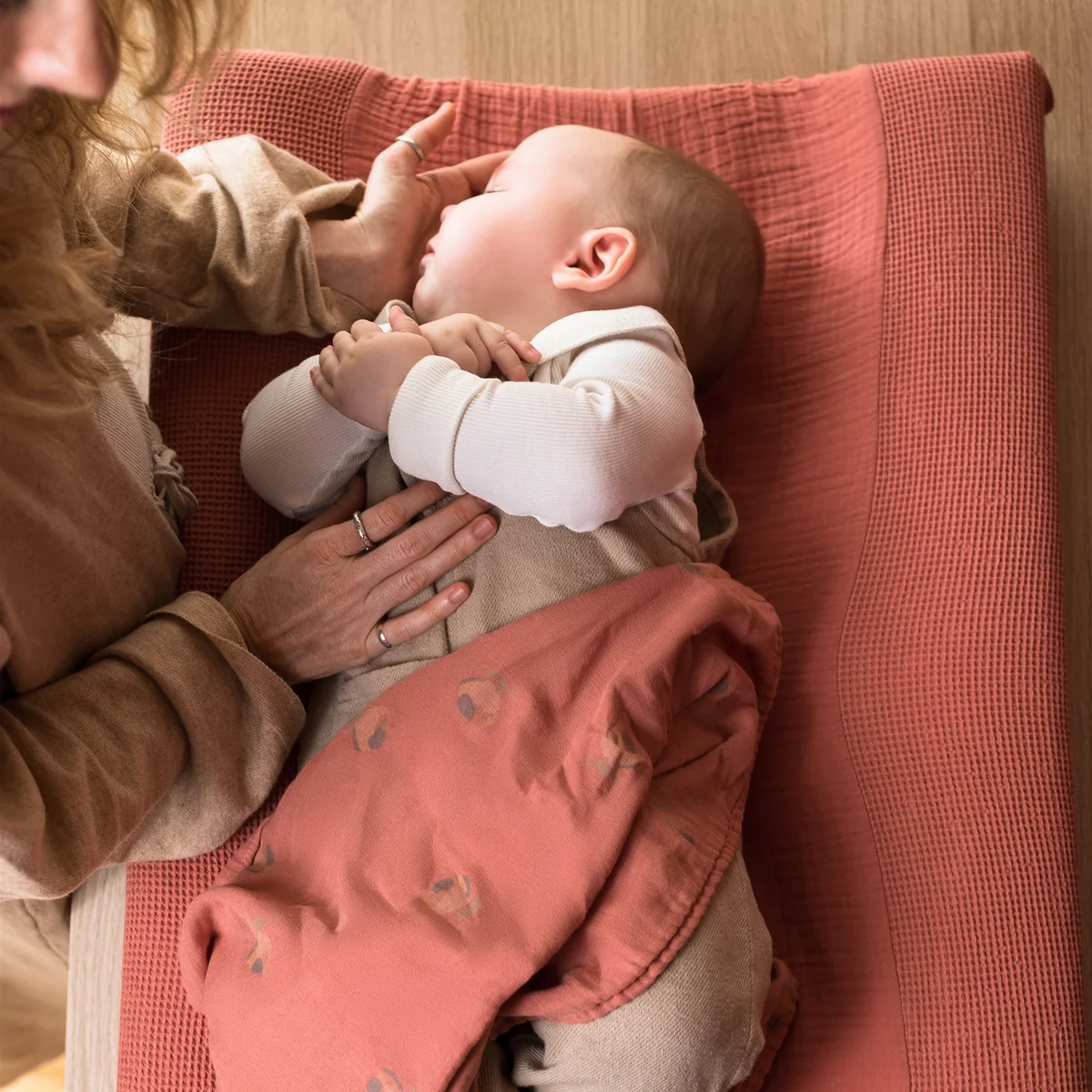 De imperfecties in het ontwerp van de hoes geven het karakter en individualiteit, terwijl de delicate kleuren en het zachte, gewatteerde oppervlak een rustige en vredige sfeer creëren die perfect is voor het verschonen en verzorgen van je baby.