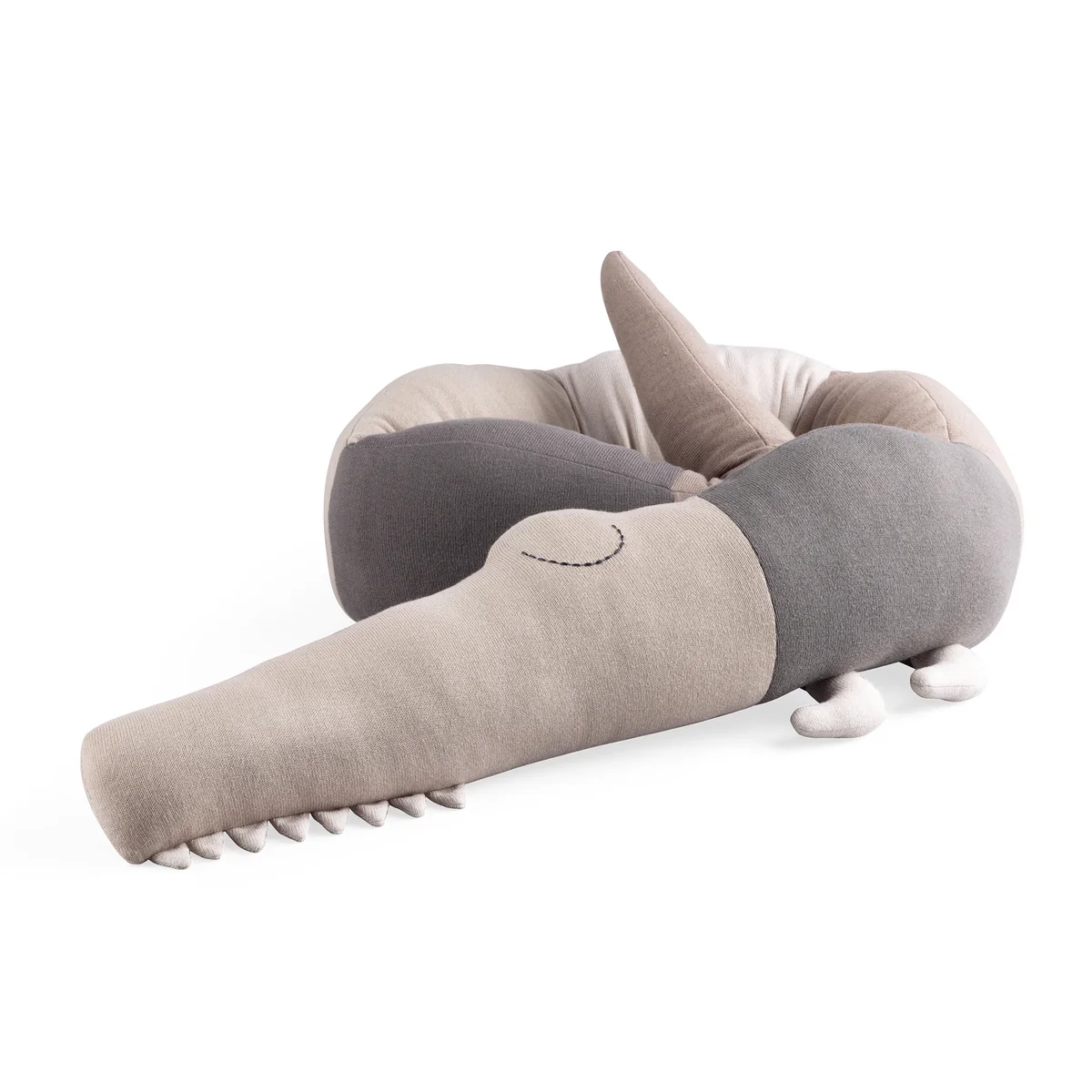 Sebra De slapende krokodil is een donzig kussen en speelgoed in één. Voor baby's kan de krokodil worden gebruikt als bedrand. Als het kind groter wordt, wordt het kussen een knus speeltje dat over het bed slingert en zich nestelt als het bedtijd is.
