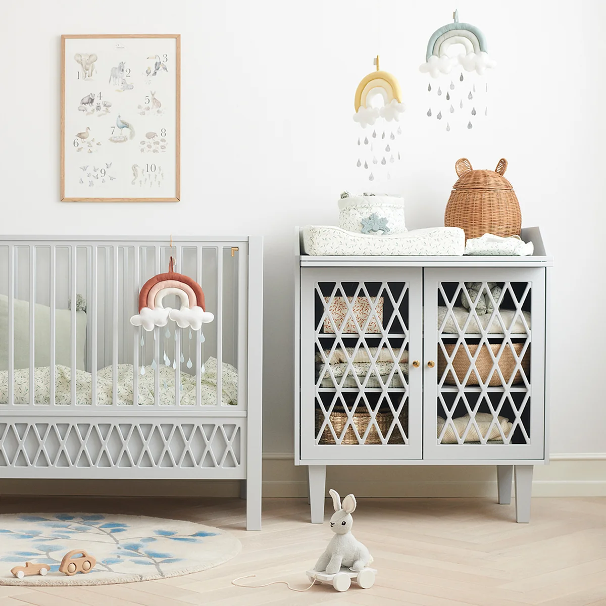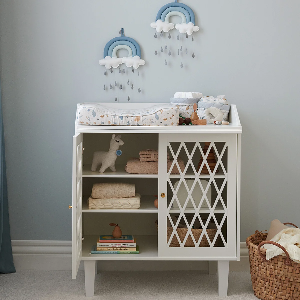 De Harlequin luiertafel van Cam Cam Copenhagen presenteert een multifunctioneel meubelstuk met talrijke functies en een tijdloze esthetiek die finesse, stijl en comfort toevoegt aan elke kinderkamer.