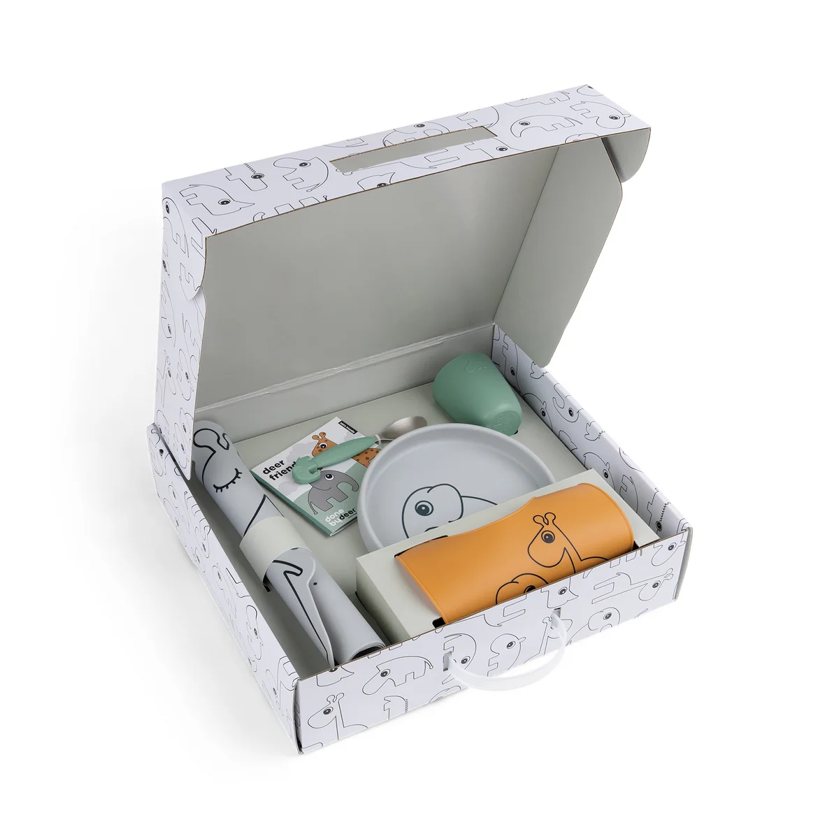 De Dinnerset geschenkdoos van Done by Deer is de perfecte compilatie van de best verkochte serviezen van het Deense bedrijf. De set bestaat uit een siliconen bord, een siliconen minibeker, een kiekeboe slabbetje, een siliconen placemat en een Easy-grip lepel. Het siliconen servies is splintervrij en heeft antislip coatings, waardoor de hele collectie ideaal is om vast te pakken. Naar behoefte kan het servies in de magnetron, oven en vriezer worden gebruikt. De set kan gemakkelijk in de vaatwasser gereinigd worden. Een Deer Friends boek wordt meegeleverd.