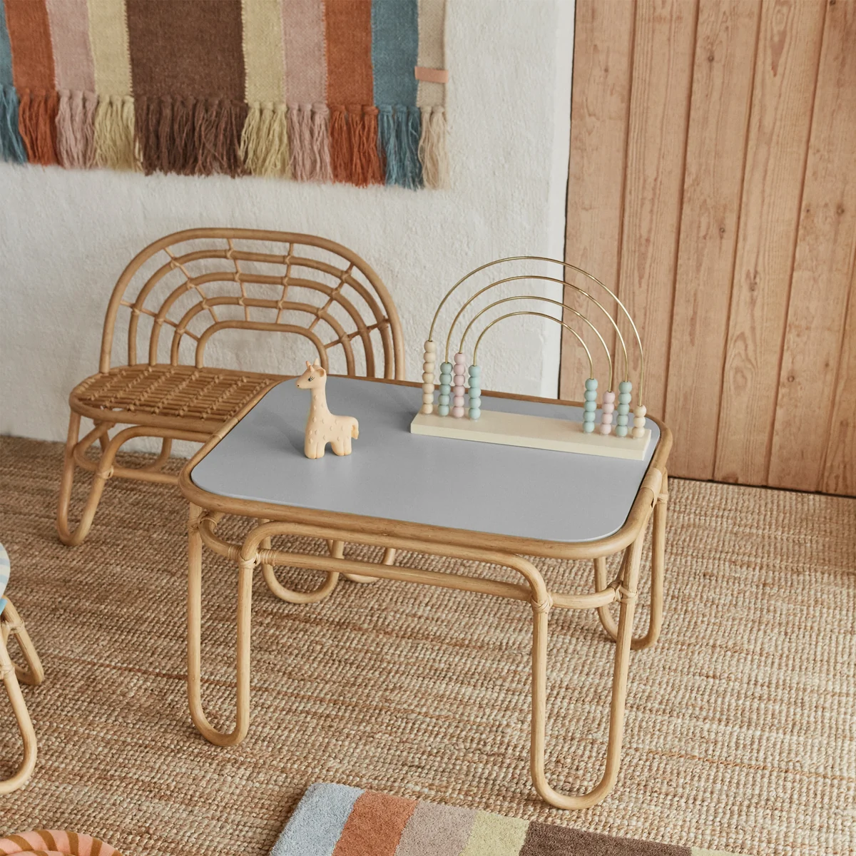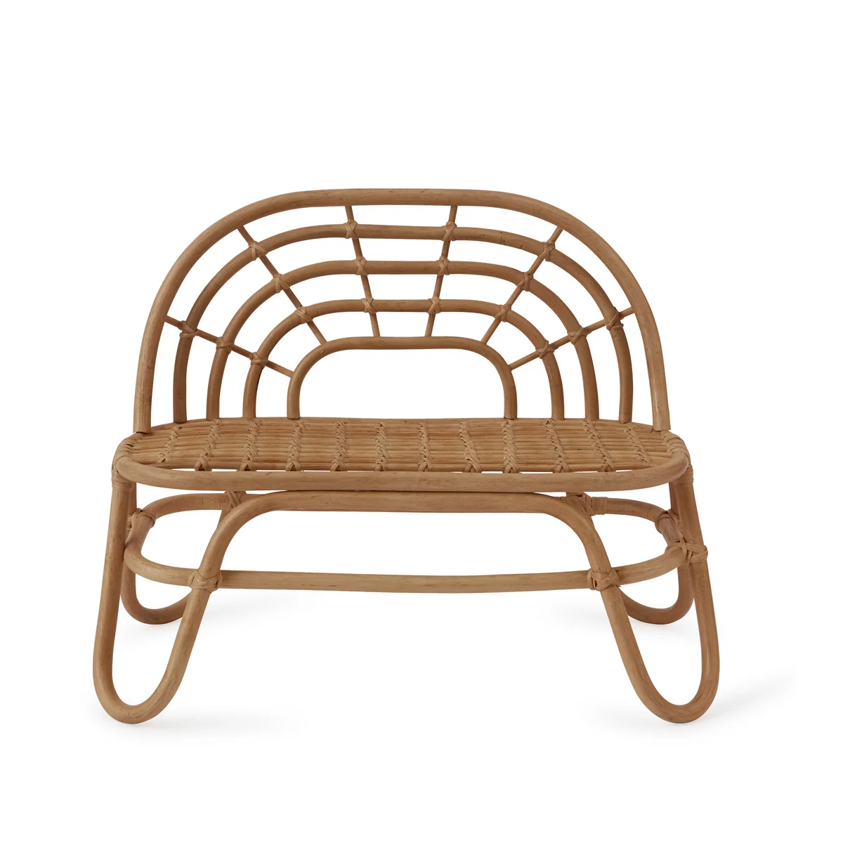 De kinderbank is gemaakt van rotan. De gebogen staven en de geweven zitting zorgen voor een natuurlijke uitstraling in de kinderkamer.