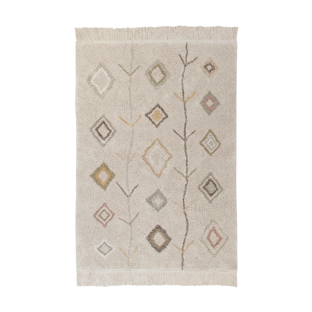 Het etnische ruitpatroon en de franjes zorgen voor een bohemien tintje. Het Kaarol Earth tapijt kan indien nodig gemakkelijk in de wasmachine gereinigd worden.