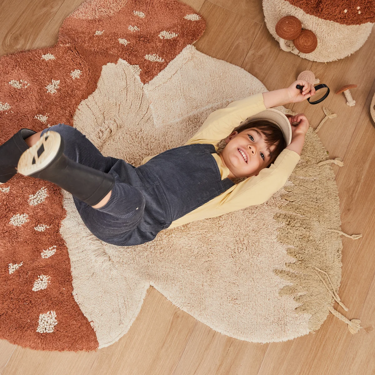 Het ontwerp van het Toadstool vloerkleed is geïnspireerd op de natuur en toont een schattige paddenstoel in levendige kleuren op een neutrale achtergrond. Dit speelse motief spreekt tot de verbeelding van kinderen en geeft de kamer een vrolijke sfeer.