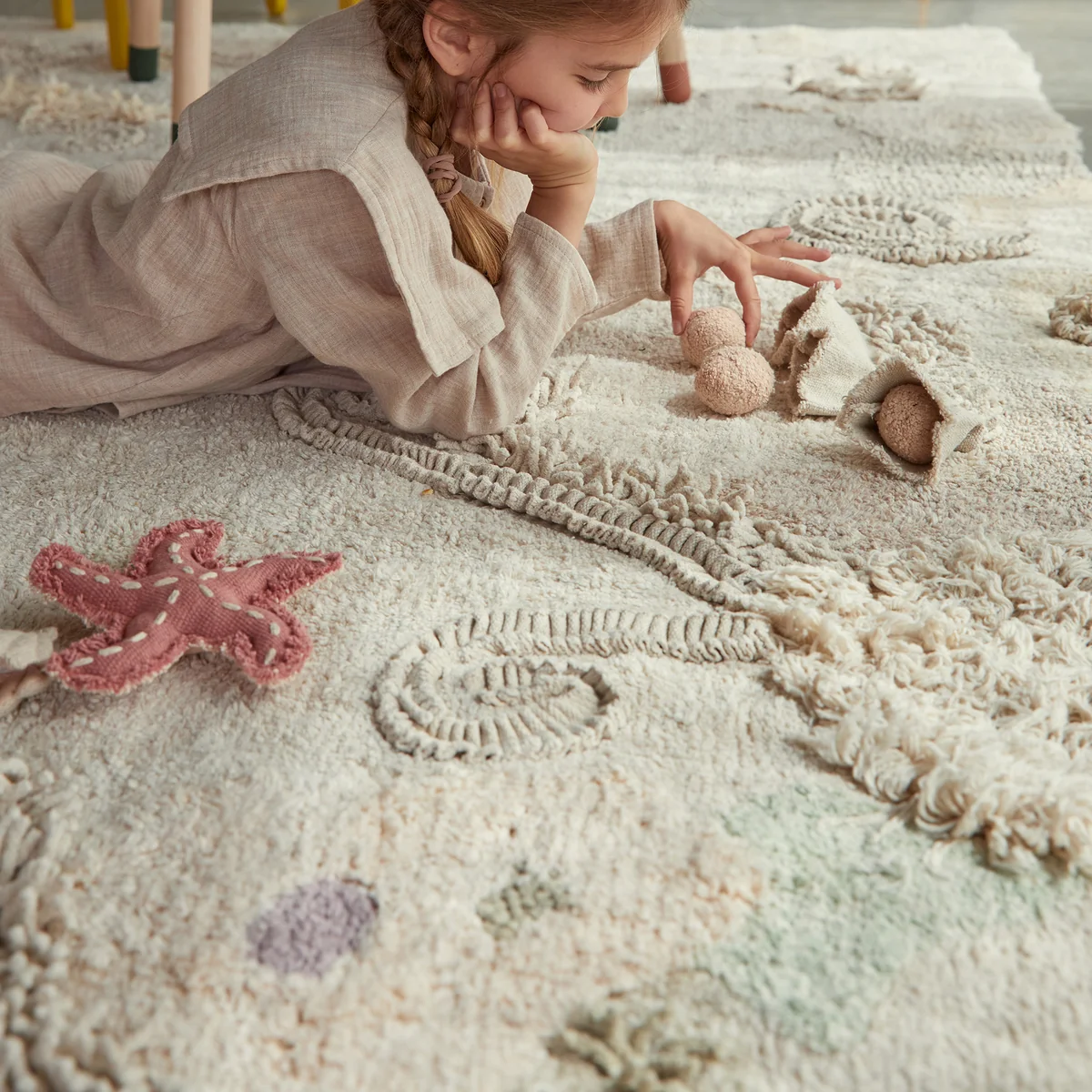 Het Seabed speeltapijt met speelaccessoires van Lorena Canals laat kinderen duiken in de oneindige wereld van de oceanen. Met dromerige elementen ensceneert het tapijt een magisch onderwaterlandschap en presenteert het zich in lichte pasteltinten die in elk interieur passen. Verschillende texturen en de bijgeleverde speelaccessoires laten de creativiteit van de kleine schatjes de vrije loop.