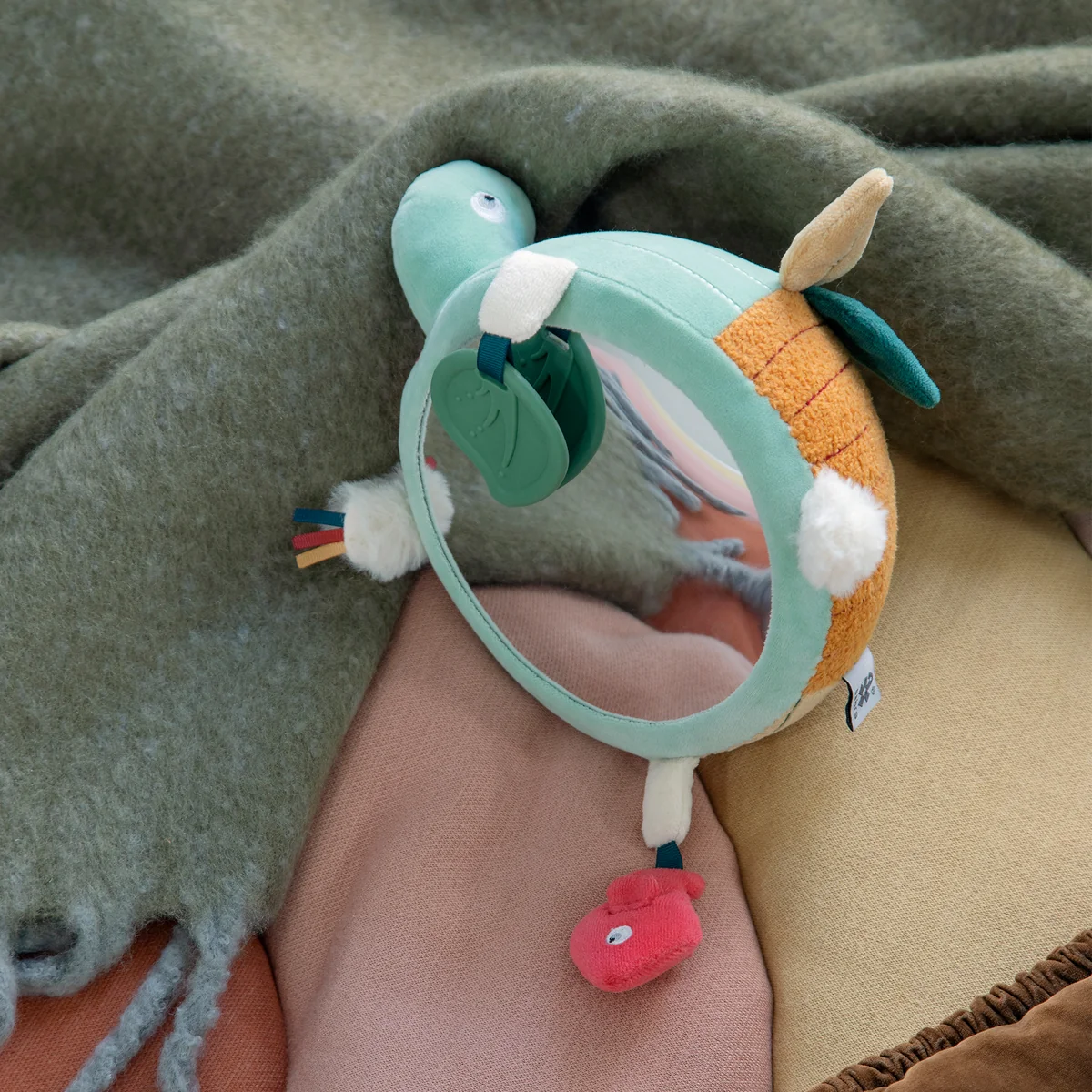 De schildpad is gevuld met traagschuim, dat zacht is en zijn vorm behoudt als de kleintjes ermee spelen. De buik is versierd met een breukvaste babyspiegel, waarmee de kleinste gezinsleden bewegingen en gezichtsuitdrukkingen kunnen observeren.