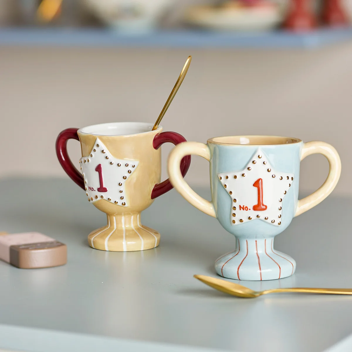 De Trophy bekers van Bloomingville MINI zorgen voor speelse charme en goede humor aan de eettafel. In de liefdevol ontworpen set van 2 doen ze denken aan kleine kopjes en zijn ze elk versierd met een ster en het opschrift "No. 1" - een liefdevol eerbetoon aan de kleine helden van alledag. Voor het ochtendritueel met chocolademelk, een kinderfeestje of als decoratief hoogtepunt in de kinderkamer - de mokken zijn een vrolijke blikvanger met karakter.