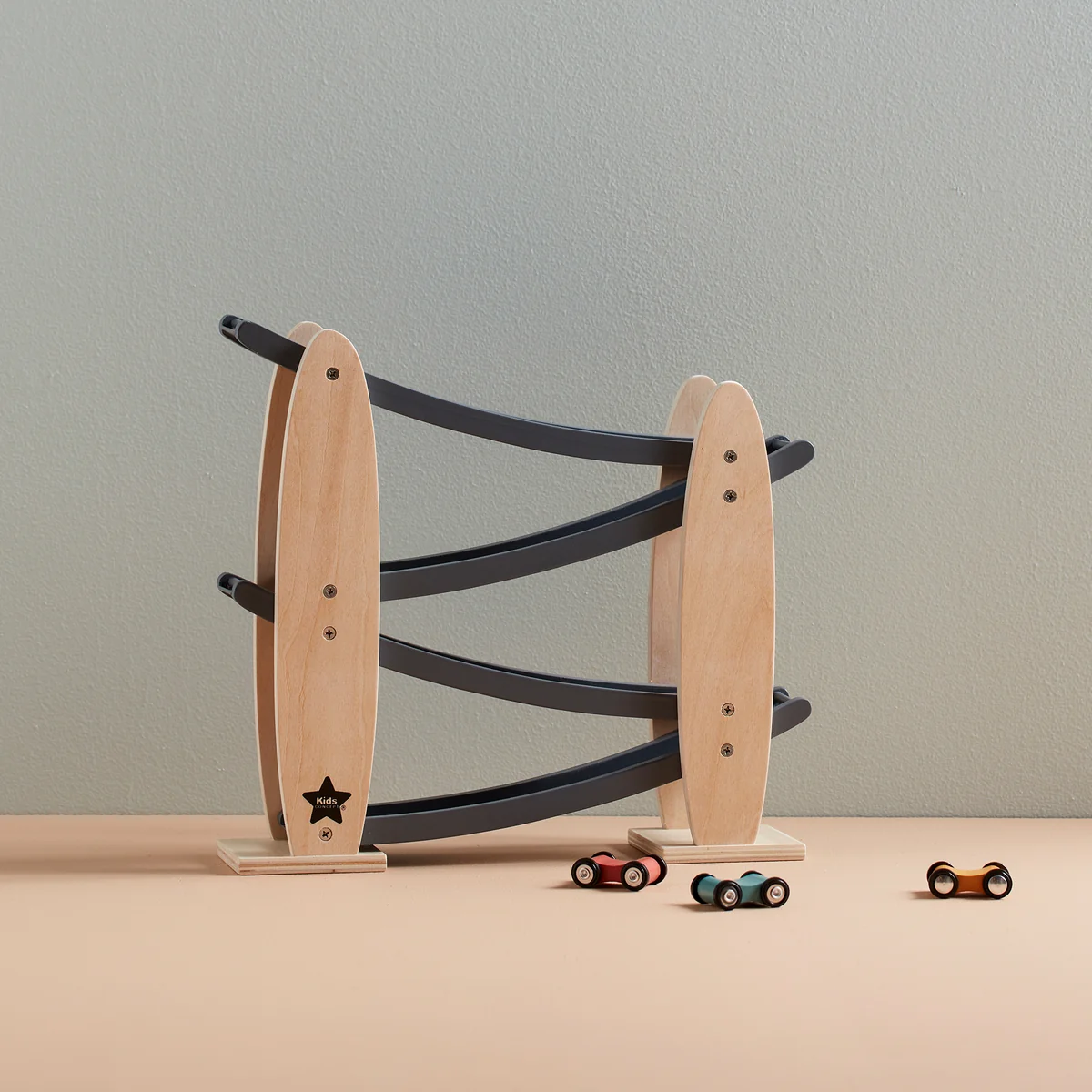 De Aiden kogelbaan met auto's van Kids Concept is een doordachte autoracebaan met drie niveaus en een ingenieuze structuur. De afzonderlijke niveaus zijn nauw met elkaar verbonden en zorgen voor een naadloze glijervaring wanneer ze van bovenaf worden losgelaten. De drie auto's racen tegen elkaar over de baan en bieden jonge kinderen een leuke manier om spelenderwijs te leren.