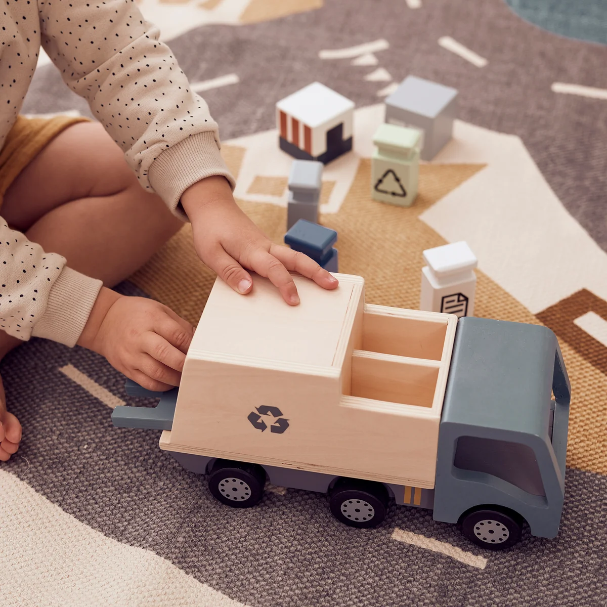 De Aiden vuilniswagen van Kids Concept is een houten vuilniswagen met vier sorteerbakken klaar voor recycling. Deze bakken kunnen op de achterste lift worden geplaatst en in de wagen worden getild. Elke bak is gelabeld met verschillende symbolen voor papier, glas en metaal, wat het sorteren makkelijker en efficiënter maakt.