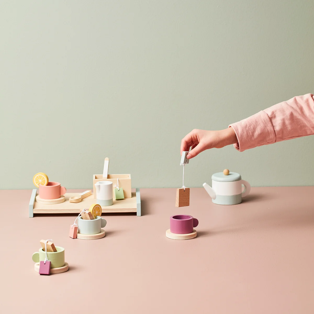 Dit Bistro houten theeservies van Kids Concept is ideaal om de verbeelding te stimuleren en is de ultieme aanvulling op elk theekransje in elke speelkamer. Het theeservies is gemaakt voor kleine handjes en is perfect voor fantasiescenario's waarbij kinderen kunnen oefenen met het inschenken van thee en melk en het toevoegen van een schijfje citroen.