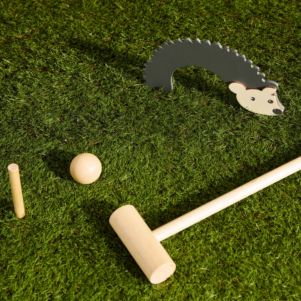 De set bestaat uit twee croquet hamers, 5 dieren hoepels, twee houten ballen en 2 haringen, allemaal geleverd in een praktische katoenen tas. De tas is gemakkelijk op te bergen en helpt het speelgoed te drogen na gebruik.