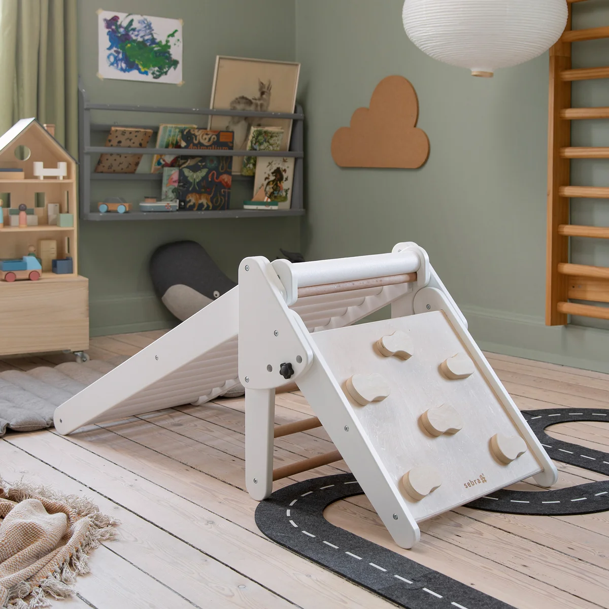 De rolglijbaan van Sebra geeft een leuk tintje aan het naar bed gaan en opstaan. De glijbaan bestaat uit zachte en comfortabele schuimrollen, die ervoor zorgen dat kinderen zich niet bezeren bij het gebruik ervan. Klimmen is een uitdaging voor het kind, want opstaan is niet zo gemakkelijk als afdalen. De multifunctionele glijbaan kan verder worden uitgebreid en aangevuld met de klimdriehoek .