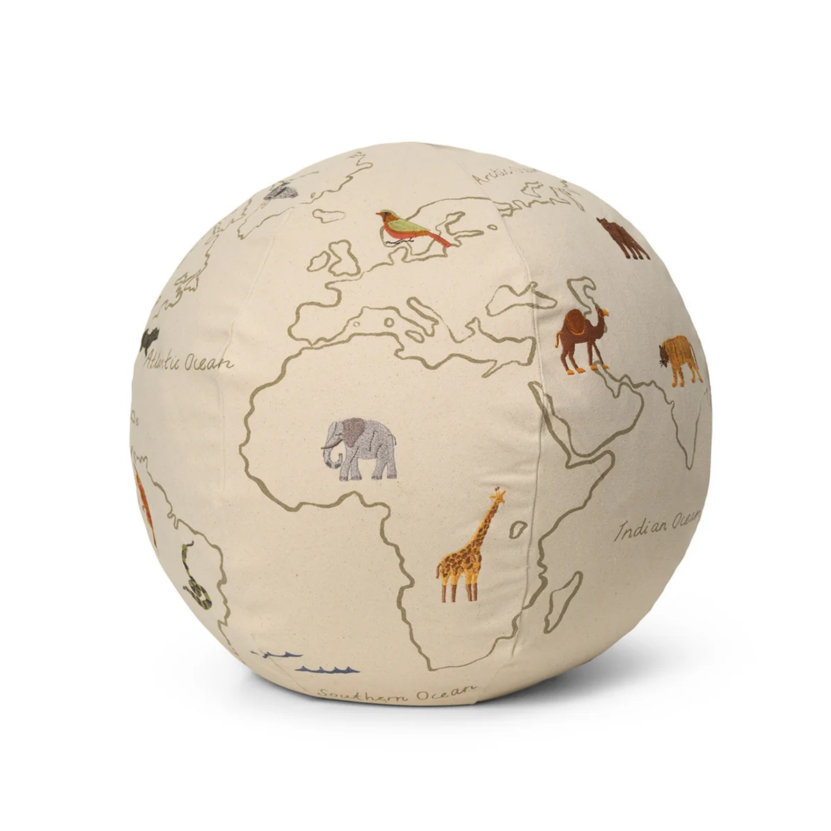 De The World Poef van de fabrikant Ferm Living inspireert niet alleen met zijn natuurlijke uitstraling, maar inspireert ook tot het leren over de continenten van de wereld. The World is een speelse toevoeging aan de kinderkamer. De omtrekken van de continenten zijn versierd met schattige, kleurrijke dierenfiguren, die op de stof zijn geborduurd. De buitenhoes van de poef is gemaakt van 100% GOTS-gecertificeerd biologisch katoen. De vulling bestaat uit vlieseline met thermische bolletjes. Veeg indien nodig schoon met een vochtige doek.