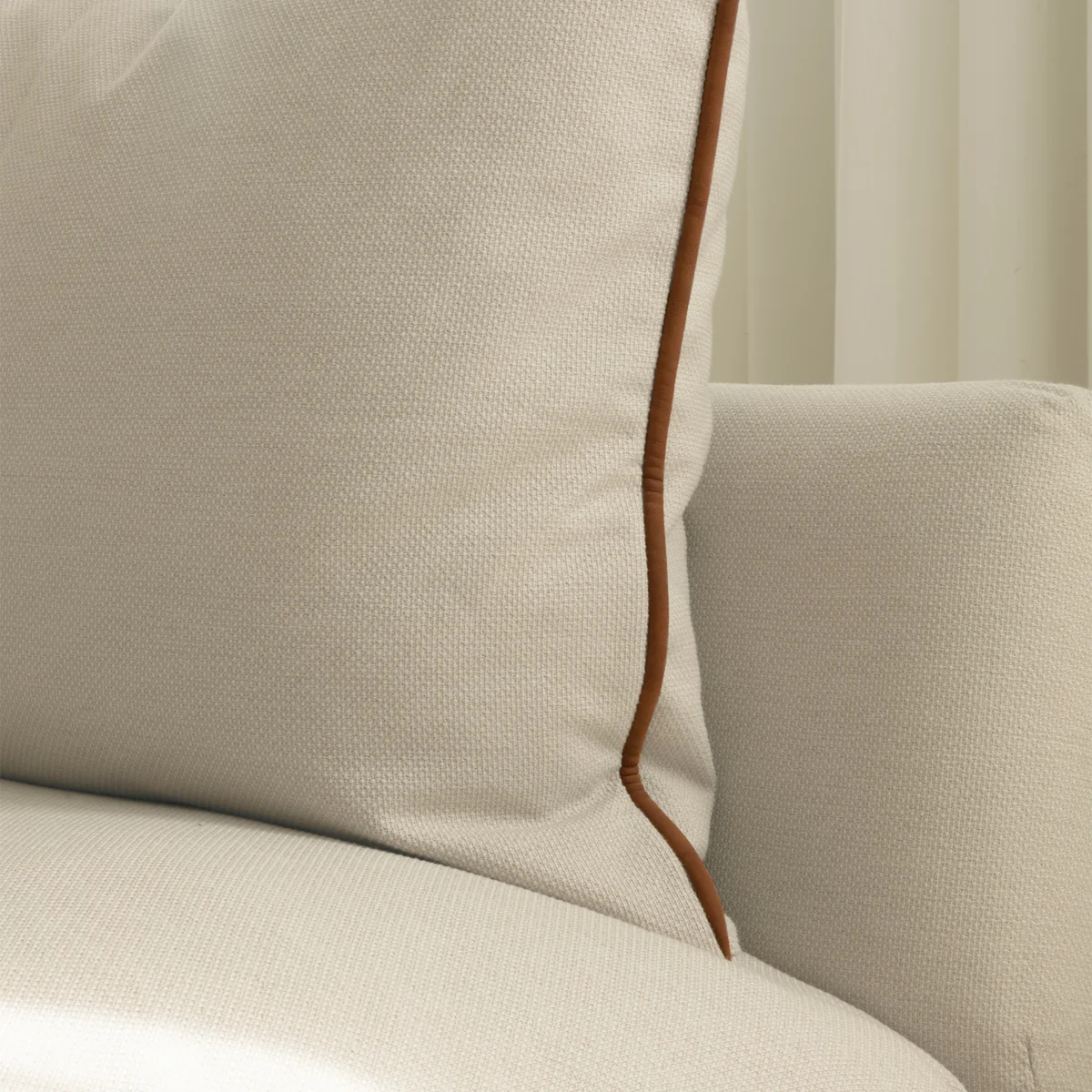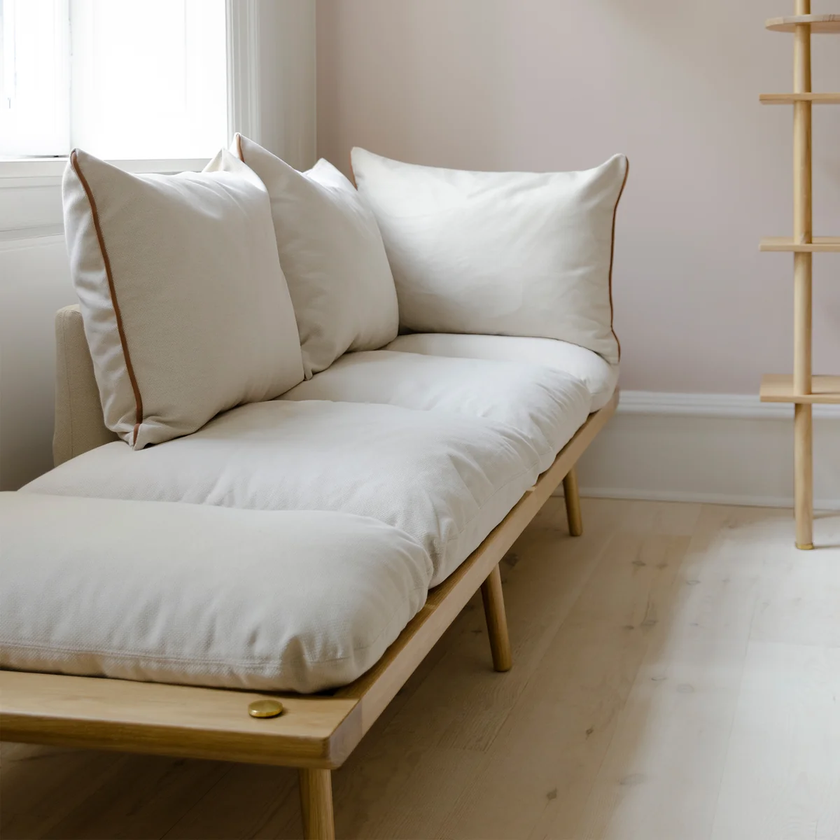 Een ander hoogtepunt is het middenkussen, dat eenvoudig kan worden omgedraaid en gebruikt als dienblad met een houten oppervlak. De dagbedbank kan verder worden geconfigureerd met extra kussens en een bijzettafel, lamp, tijdschriftenhouder of hoofdsteun.