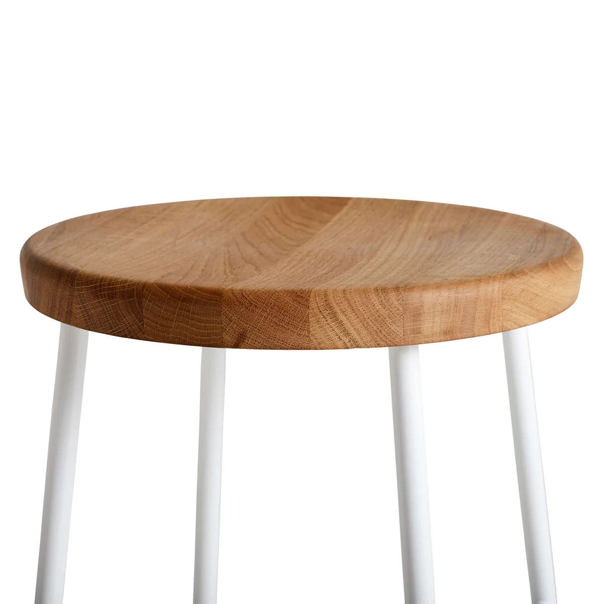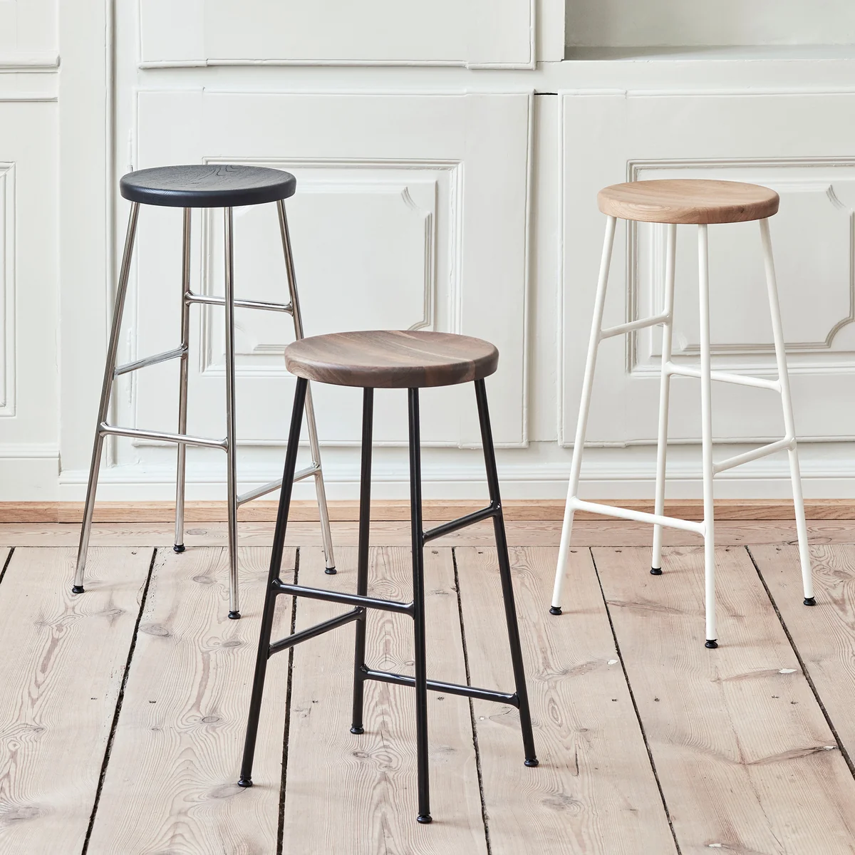 De kruk is verkrijgbaar in twee verschillende hoogtes, met een keuze uit verschillende houtafwerkingen voor de zitting en verchroomde of gepoedercoate kleuren voor de poten. De stoelen zijn geschikt voor bars, keukeneilanden en aanrechtbladen in diverse private en publieke plaatsen.