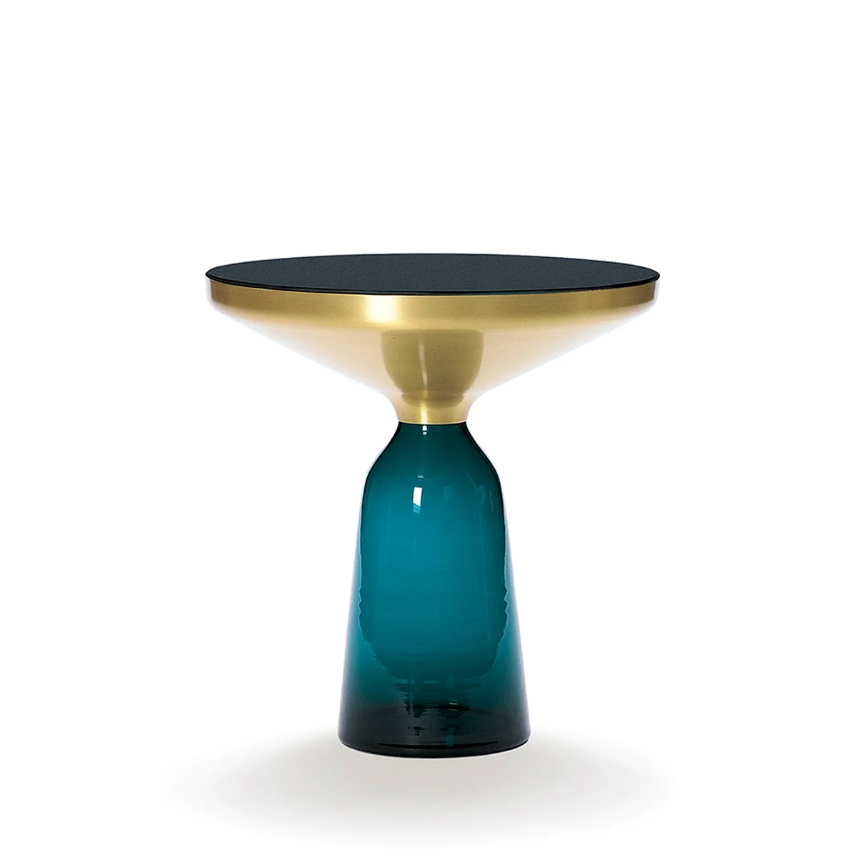 De bijzettafel Bell van Sebastian Herkner zet de gebruikelijke omgang met materialen op zijn kop en verrast de waarneming: hier wordt de tafelvoet een beknopte, kleurrijk-transparante glazen vorm in de ruimte, waarop een metalen lichaam rust.