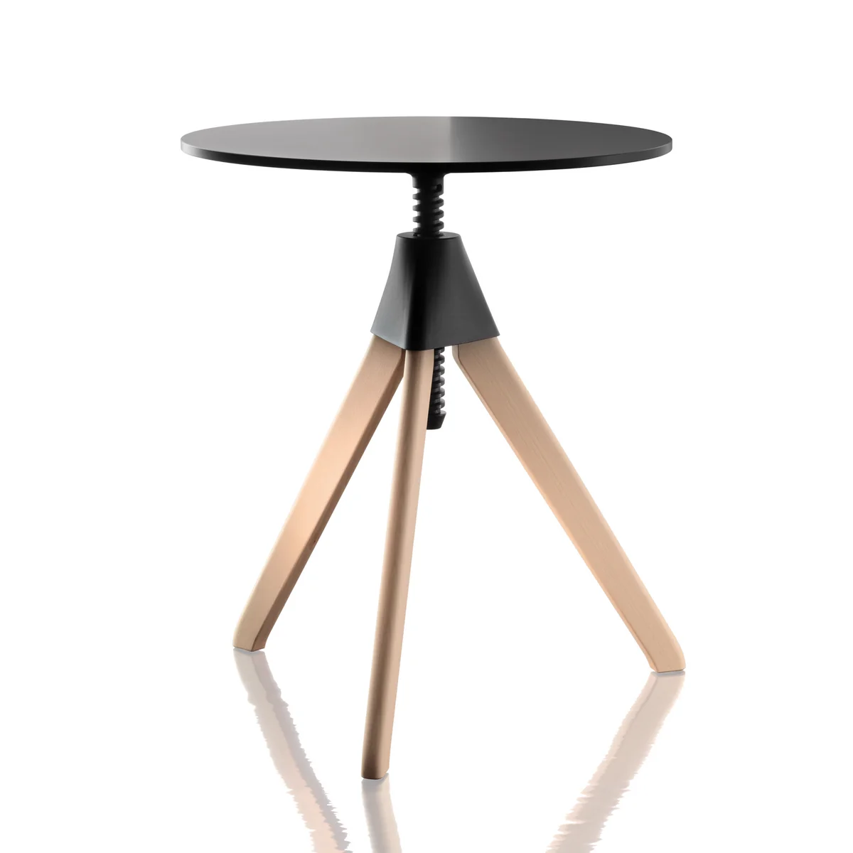 De Topsy bijzettafel van Magis is door de intelligente constructie en de industrieel aantrekkelijke schroefdraad in hoogte verstelbaar tussen 64.5 en 80,5 cm.