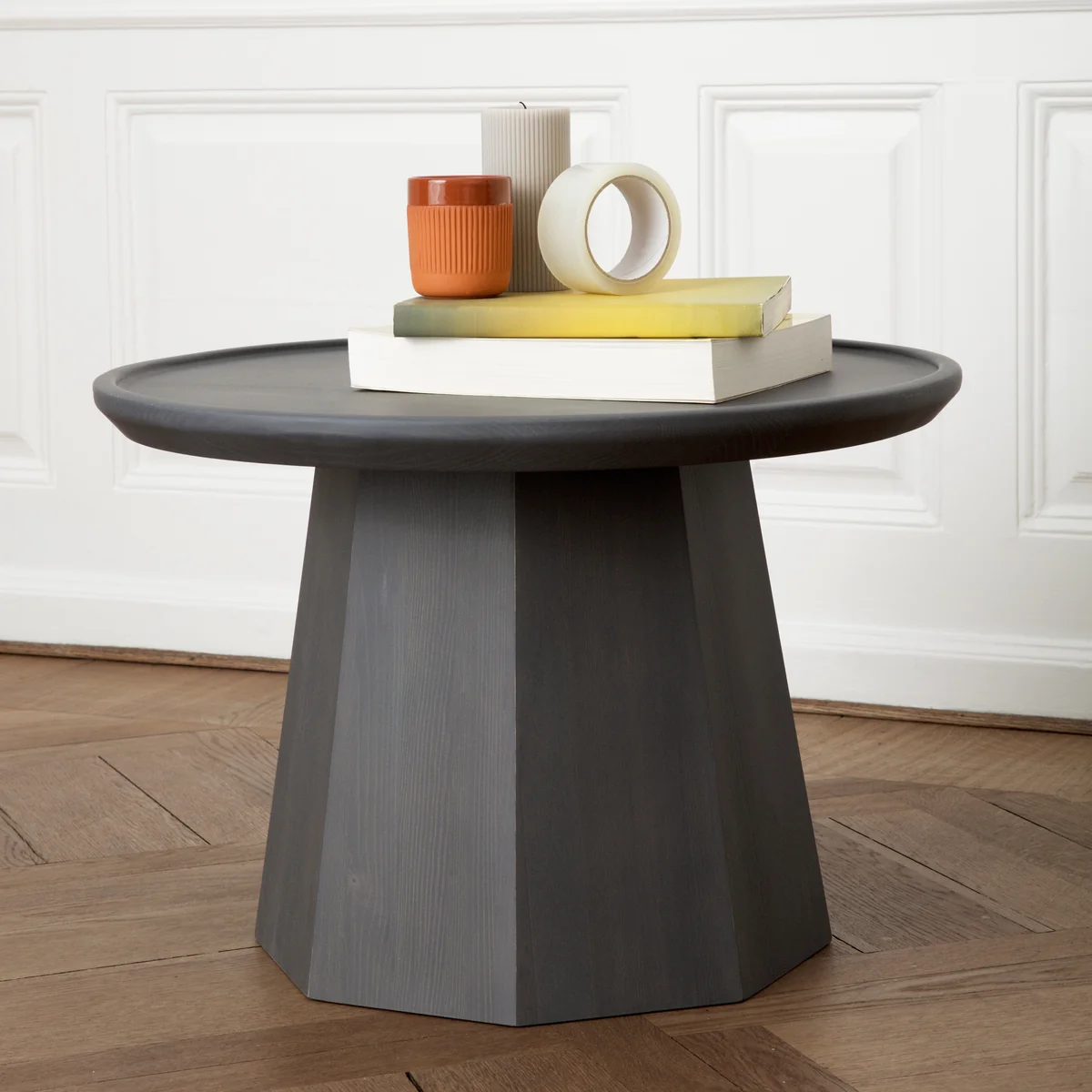 Een volumineuze achthoekige voet maakt de tafels een Pine tafels een blikvanger in elke kamer. Het dunne, ronde tafelblad met een afgerond onderstel contrasteert met het onderstel en zorgt ervoor dat de houten constructie er licht uitziet. De duidelijk zichtbare nerf van het dennenhout zorgt ook voor een blikvanger. De ten onrechte vergeten houtsoort krijgt in deze speelse compositie nieuwe aandacht.