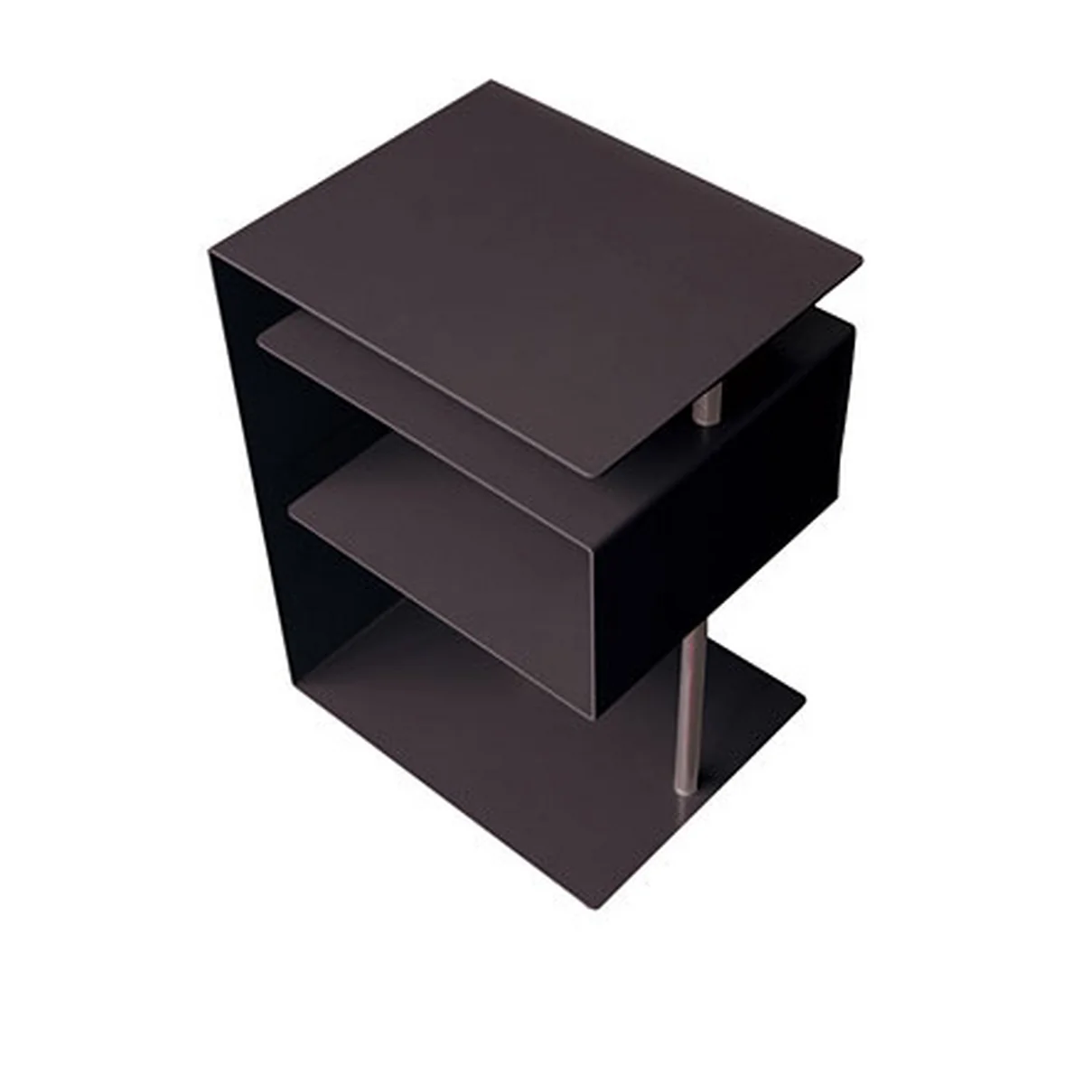 De x-centrische tafel van Radius Design bestaat uit gepoedercoat staal. De roestvrijstalen buis die als as dient voor de opvouwbare plaat is bedekt met een acrylglaslaag.