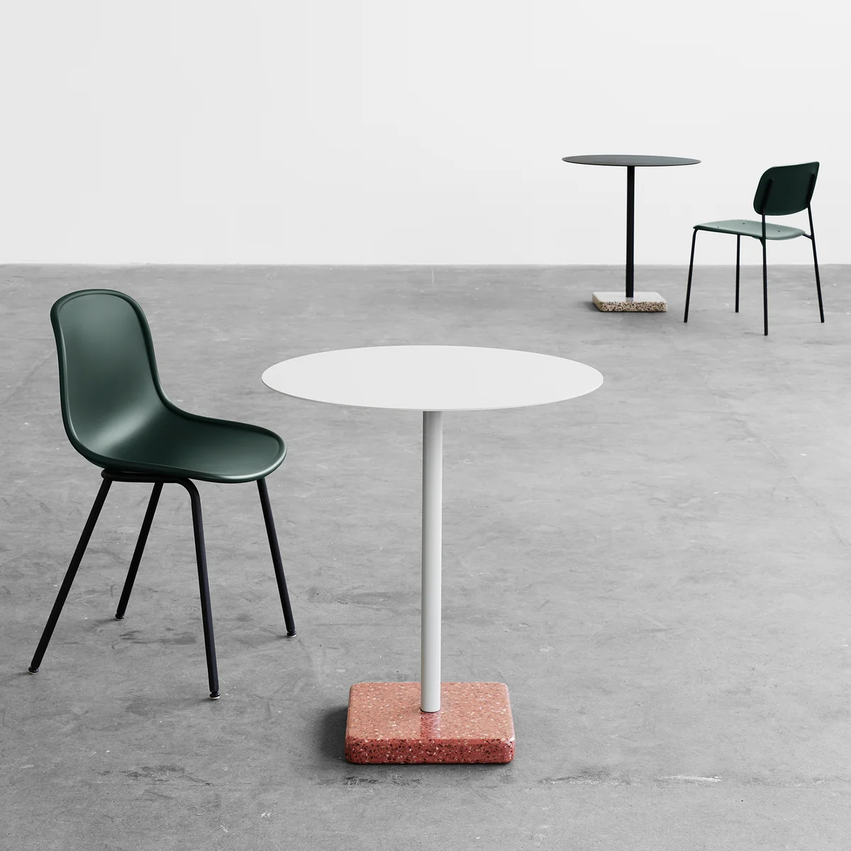 Terwijl het ronde tafelblad is gemaakt van duurzaam, gepoedercoat staal, is het onderstel gemaakt van massief Terrazzo . Ondanks de robuuste eigenschappen lijkt dit kleurrijk en enigszins speels, waardoor er een stilistische, opzettelijke breuk ontstaat tussen de bovenkant en de basis. Hoewel Terrazzo vergelijkbare eigenschappen heeft als beton, heeft het vroegere materiaal een veel indrukwekkender oppervlak dat niet onopgemerkt blijft.