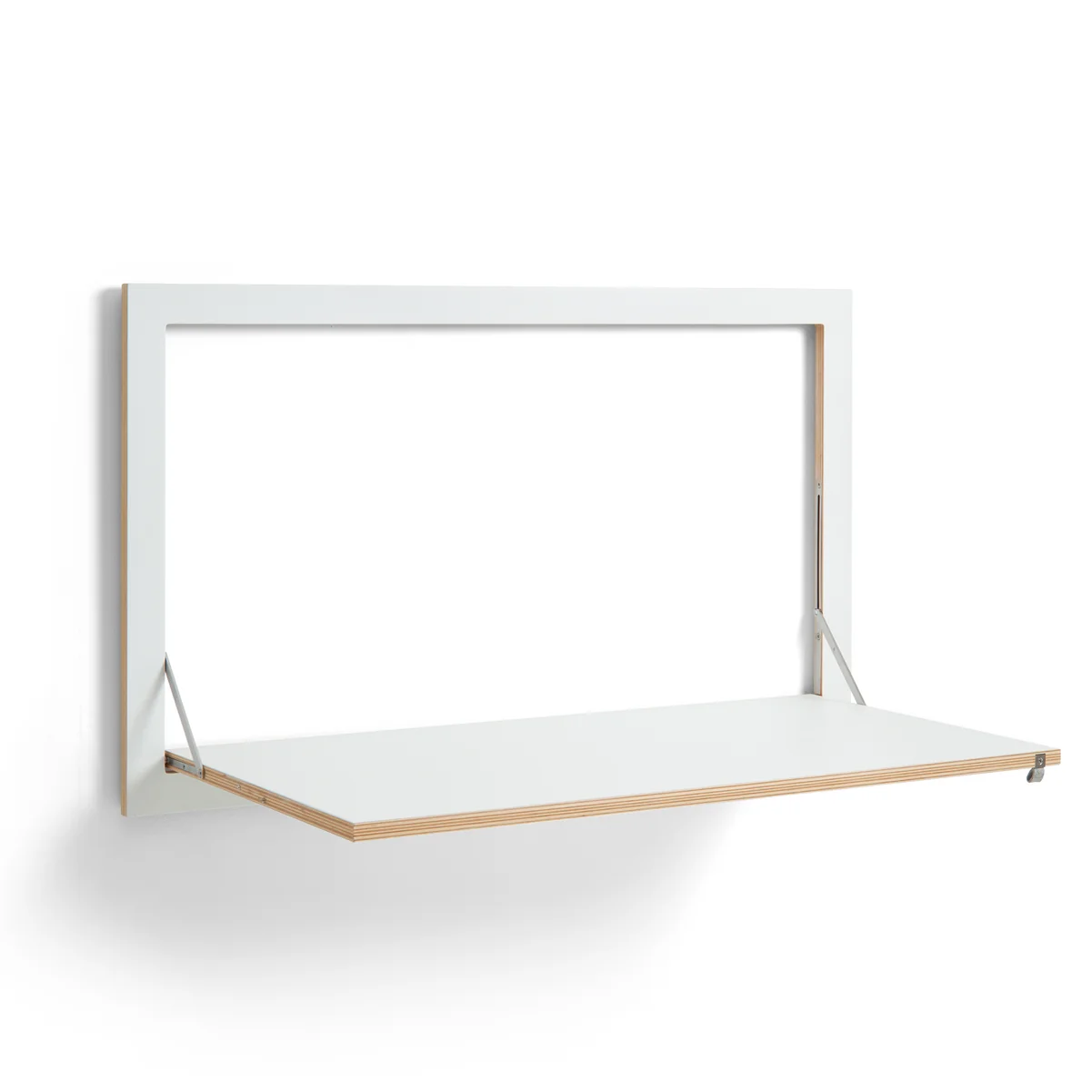 De secretaire voor aan de muur is gemaakt van FSC®-gecertificeerd berkenmultiplex, terwijl de inklapbare functies gemaakt zijn van roestvrij staal. Een kleine vilten lus vergemakkelijkt het uitklappen van het werkblad. De oppervlakken zijn met de hand gelakt en verkrijgbaar in verschillende kleuren en motieven. In wit past het bureau bijvoorbeeld goed bij de muur in dezelfde kleur, terwijl een bureau met motief in opgeklapte toestand een decoratieve afbeelding aan de muur wordt.