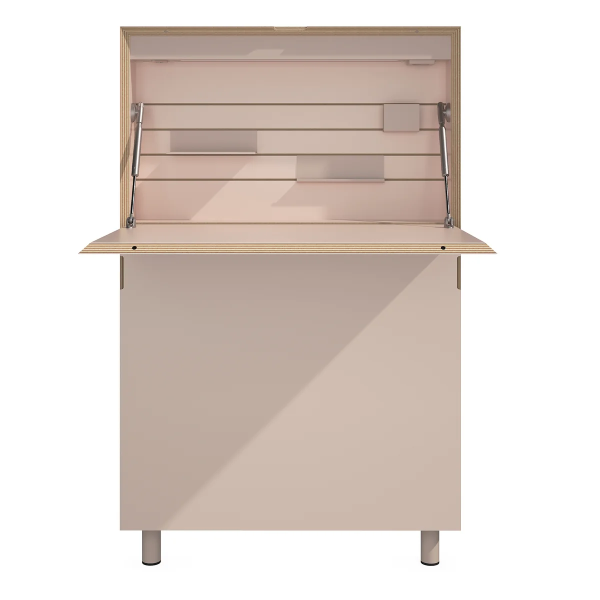 De Flatmate De secretaire van Müller Small Living is waarschijnlijk de kleinste volledig uitgeruste secretaire op de markt. Met zijn minimalistische ontwerp en geringe diepte past hij zelfs in de kleinste Flatmate Hij past zelfs in de kleinste ruimte en biedt opberg-, archiverings- en schrijfruimte.
