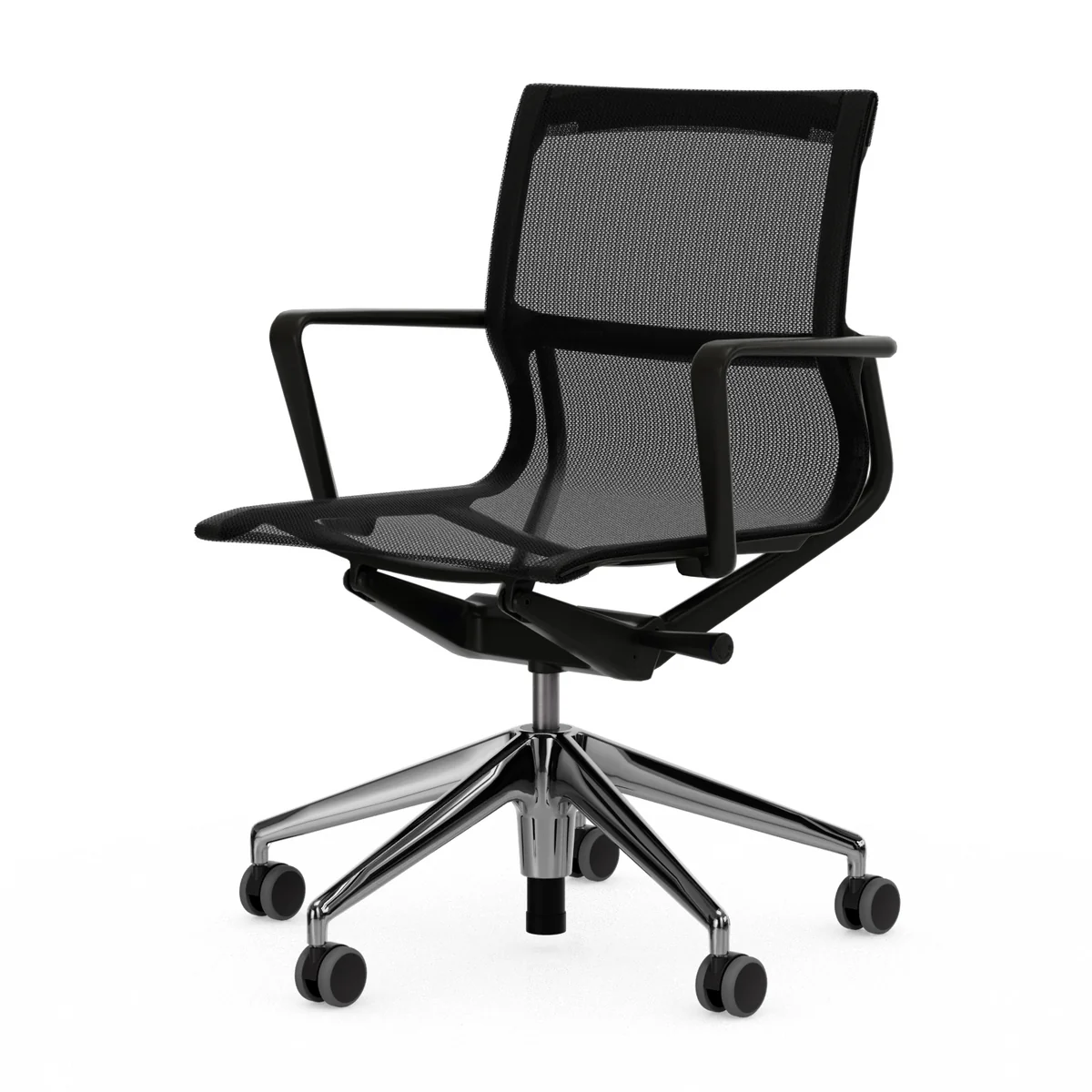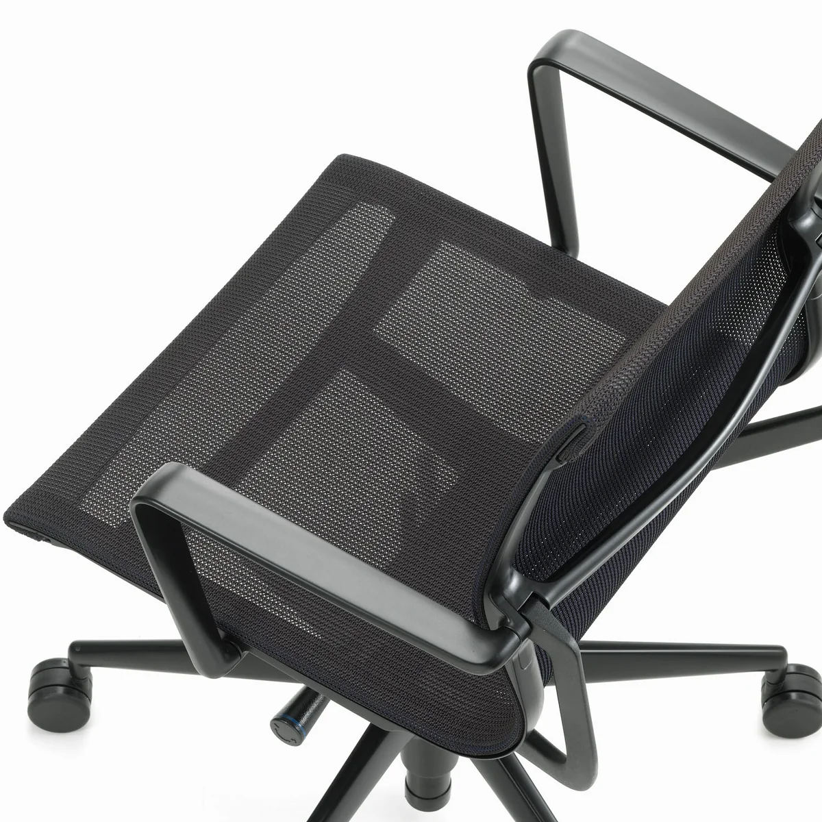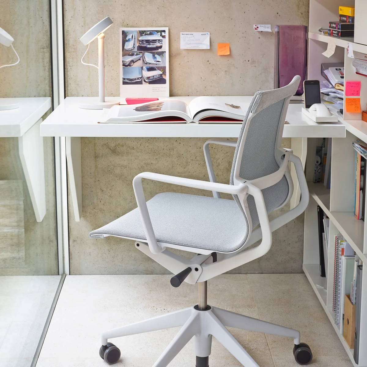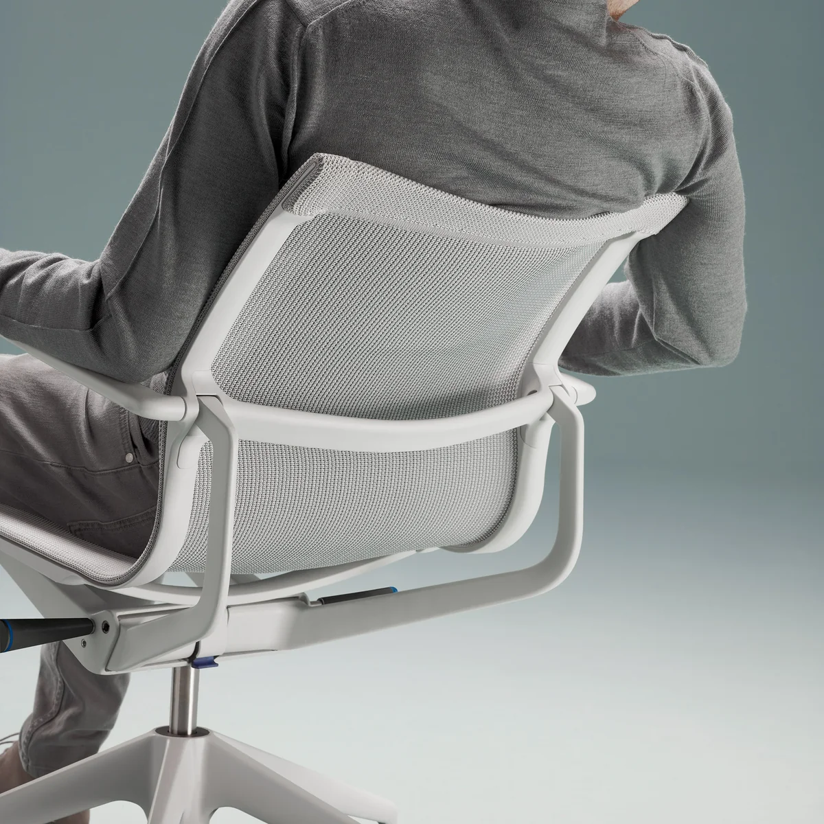 Het gebreide textiel maakt ook de visuele gewichtloosheid mogelijk als de stoel met zijn transparantie en een vrij genuanceerde kleurencombinatie mogelijk is. Het kunststof frame en de gebreide coating zouden een dynamische, maar nog steeds niet gecontroleerde beweging vormen als ze de enige onderdelen van de stoel waren. Alleen met het synchroonmechanisme kan Physix een nauwkeurig gerichte, biomechanische beweging aanbieden. Twee opvallende aluminium beugels aan de achterzijde van de stoel geven de beweging van de laterale holtes door aan het spiraalveersysteem, dat in de behuizing onder de zitting is opgenomen. Zo wordt een geregelde beweging in elke zitpositie en gewichtsbelasting precies gecontroleerd.