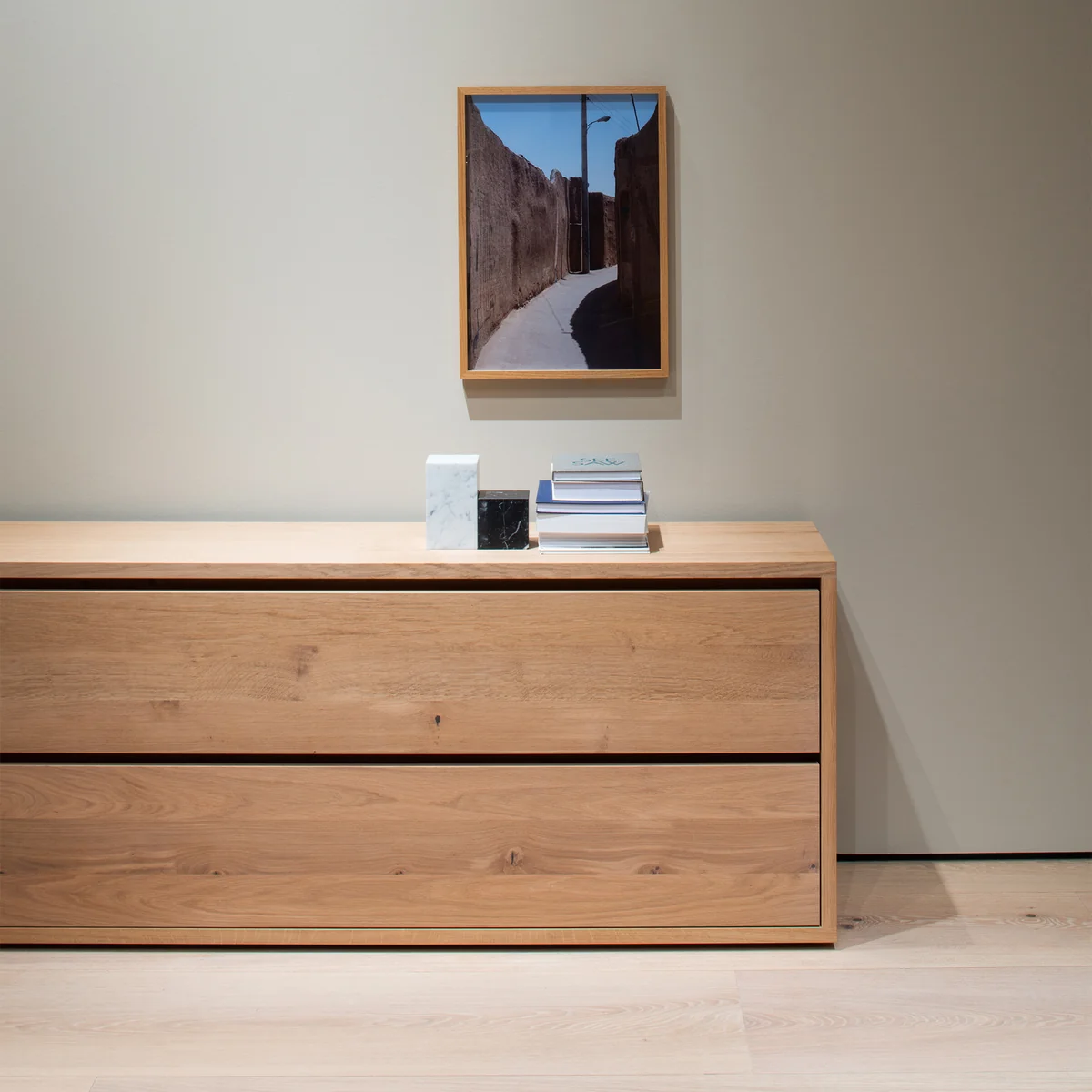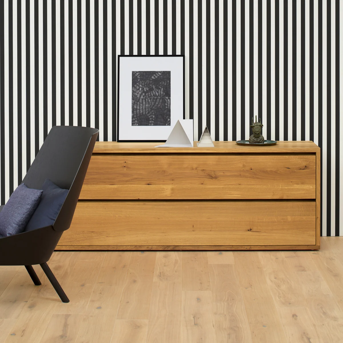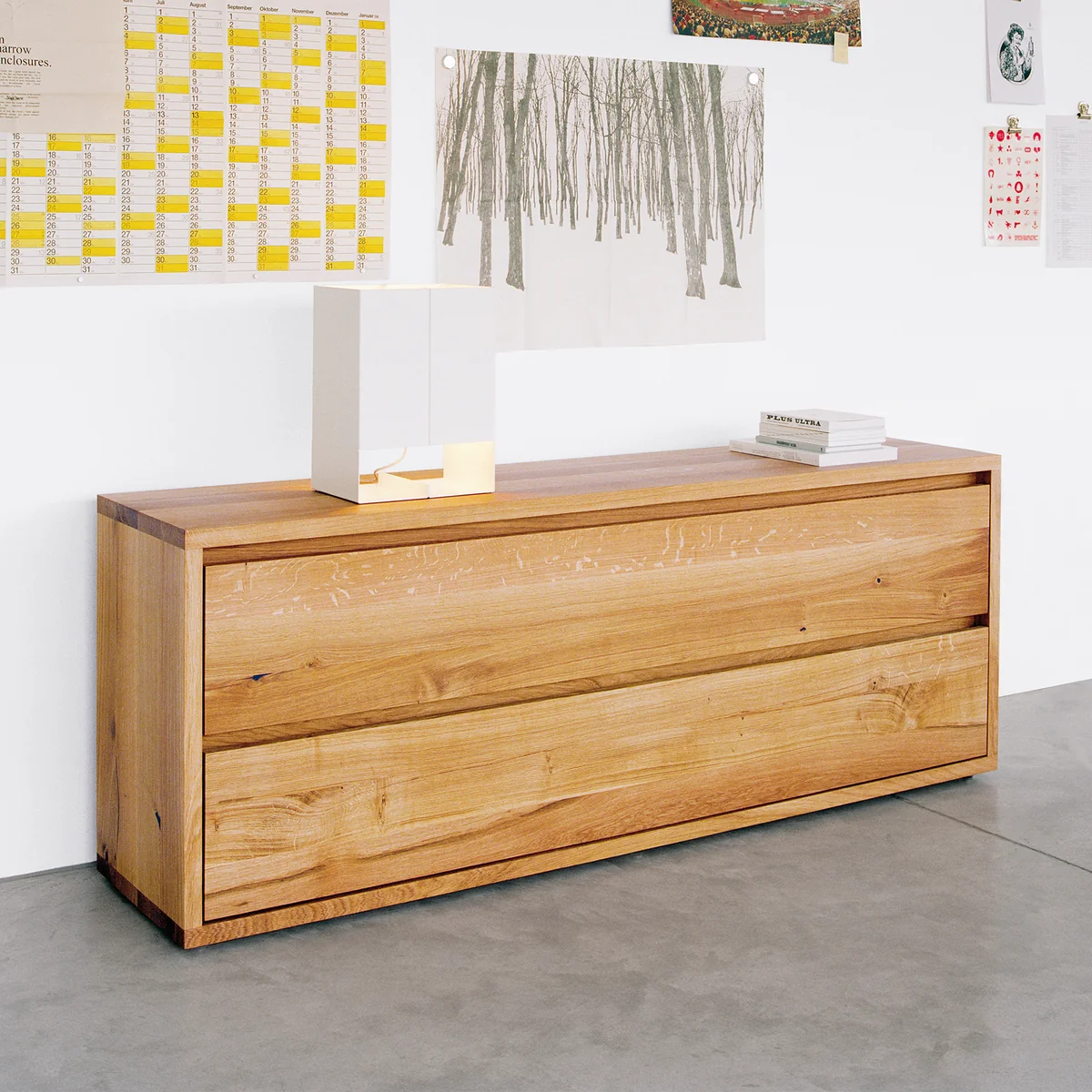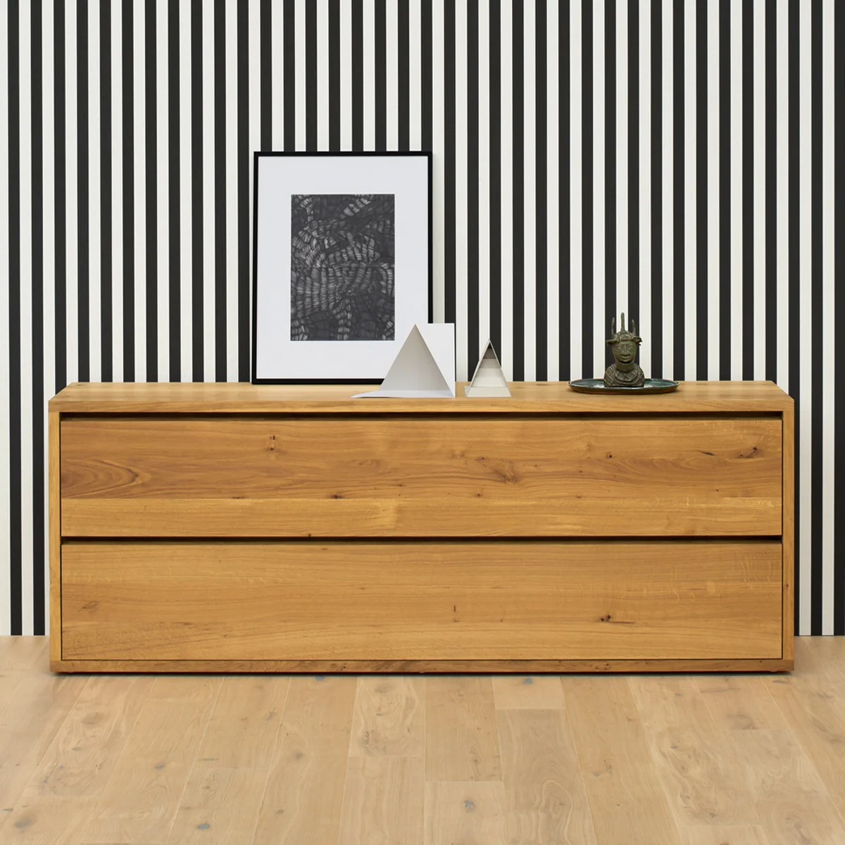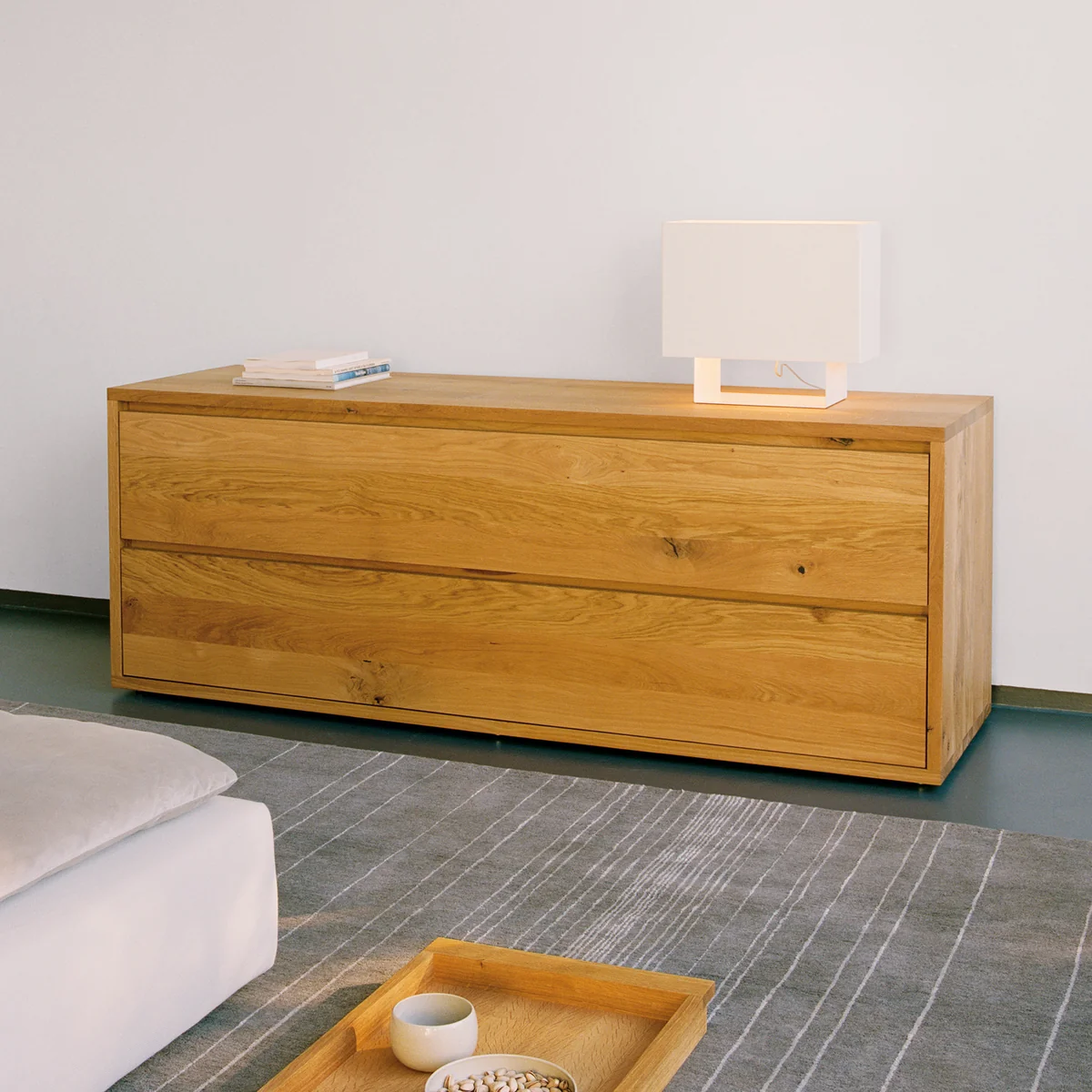 e15 De ladekast Imari, ontworpen door Philipp Mainzer in 2004, belichaamt de hoogwaardige materiaalesthetiek en weerspiegelt uitzonderlijk vakmanschap. De commode is gemaakt van 30 mm dik massief hout en wordt gekenmerkt door zijn heldere, minimalistische vorm, waarbij de doorlopende opening op de ladefronten dienst doet als greeplijst. Dit ontwerp zorgt voor een elegante, greeploze look. De twee ruime lades bieden veel opbergruimte, met interne afmetingen van L 900 / 700 / 500 x D 370 x H 180 mm. Er is een stalen gewicht verkrijgbaar voor extra stabiliteit bij vrijstaande plaatsing en voor de veiligheid is wandmontage gespecificeerd om kantelen te voorkomen. Met de verstelbare poten kan de ladekast perfect waterpas worden gezet. De Imari ladekast wordt geleverd in één stuk en wordt geleverd met een onderhoudsset om de geoliede of in de was gezette oppervlakken op lange termijn te behouden.