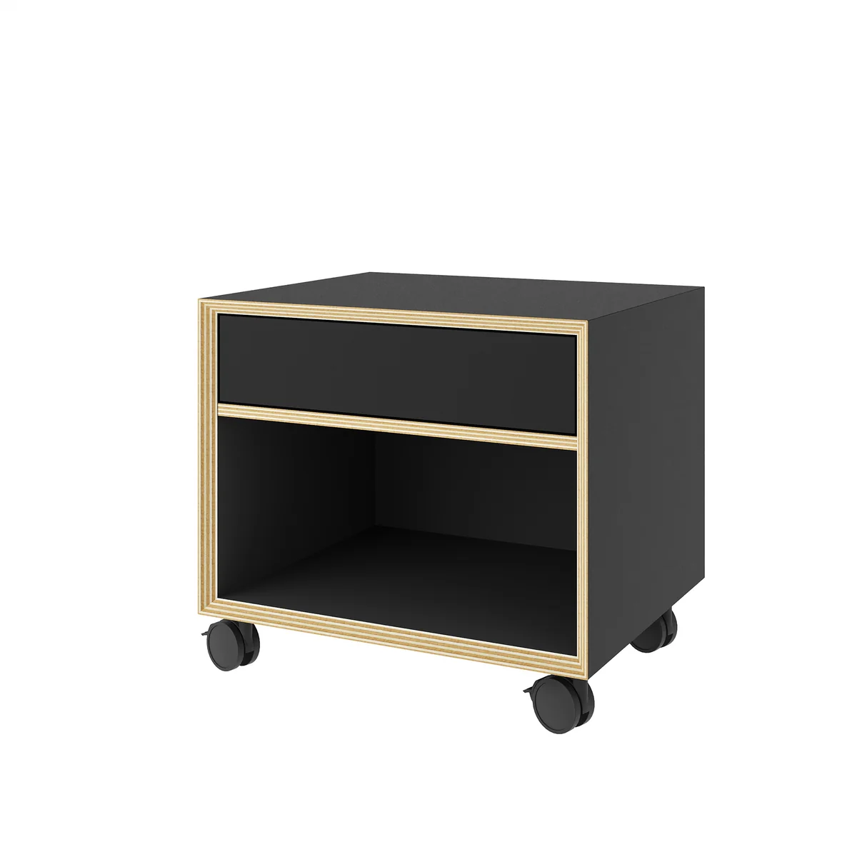 De Vertiko kleine ladekast van Sascha Sartory is een multifunctioneel meubel dat flexibel kan worden gebruikt als nachtkastje, container of bijzettafel. Hij is verkrijgbaar in twee versies: met een kleinere lade bovenaan en een open vak onderaan of omgekeerd. De ladekast wordt standaard geleverd met zwarte 25 mm hoge poten, maar kan optioneel worden uitgerust met wielen (totale hoogte 480 mm) of metalen poten (totale hoogte 500 mm) in zwart, wit of antraciet.