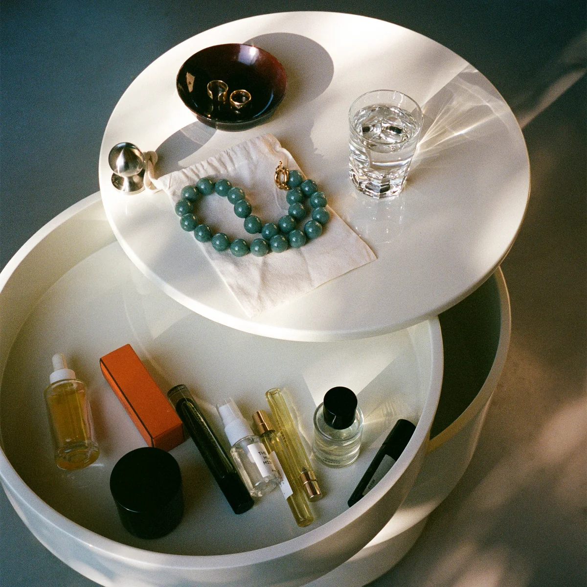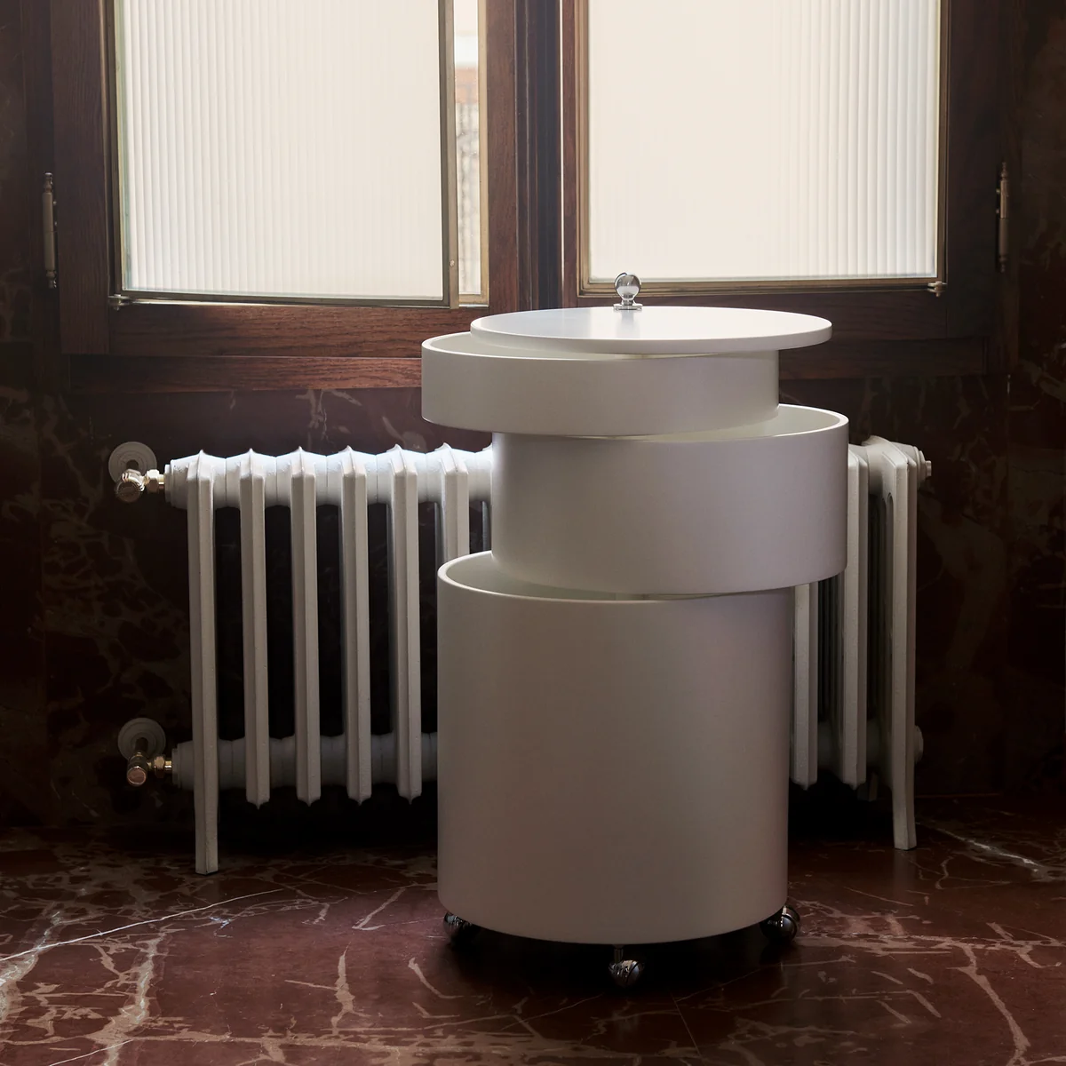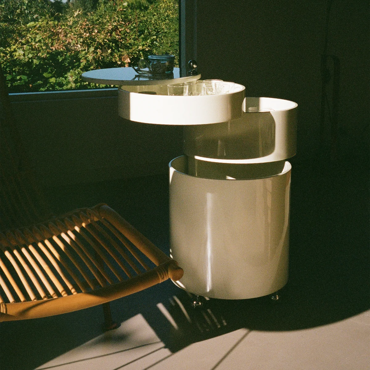 In gesloten toestand verstoort niets de cilindrische vorm en de heldere lijnen van de Barboy . Geopend biedt het meerdelige meubel drie compartimenten van verschillende grootte, waarvan de twee bovenste naar buiten kunnen worden gedraaid. De compartimenten bieden ruimte voor allerlei baraccessoires - van talloze flessen en glazen tot kurkentrekkers of onderzetters, alles kan worden opgeborgen in de houten onderkast. Barboy onder.
