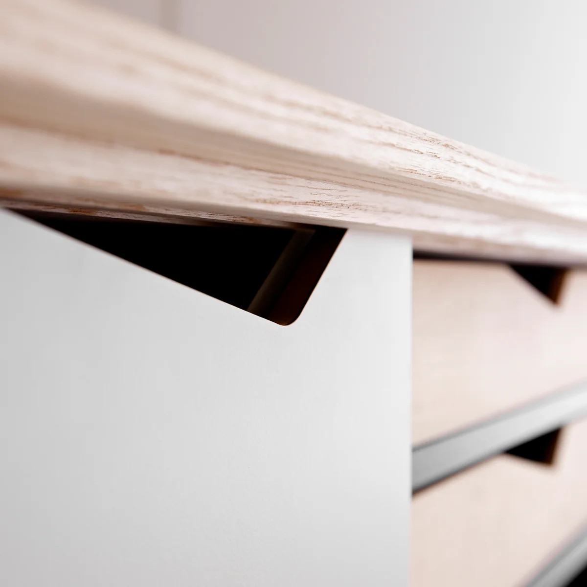 Bovendien kan het dressoir worden voorzien van laden en legplanken met elegante pengatverbindingen, zodat S1 niet alleen visueel overtuigend maar ook functioneel is. Deuren en laden kunnen volledig zonder gereedschap worden gemonteerd. Dit betekent dat het uiterlijk van de commode snel en flexibel kan worden veranderd, afhankelijk van de behoeften. De lade is een los inzetstuk dat ook voor andere doeleinden kan worden gebruikt, bijvoorbeeld als dienblad. Op S1 is het mogelijk een wartel in de achterwand te boren (de positie van de gaten moet bij de bestelling worden aangegeven!).