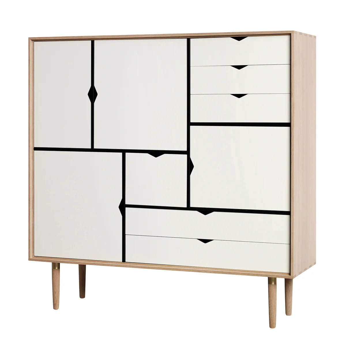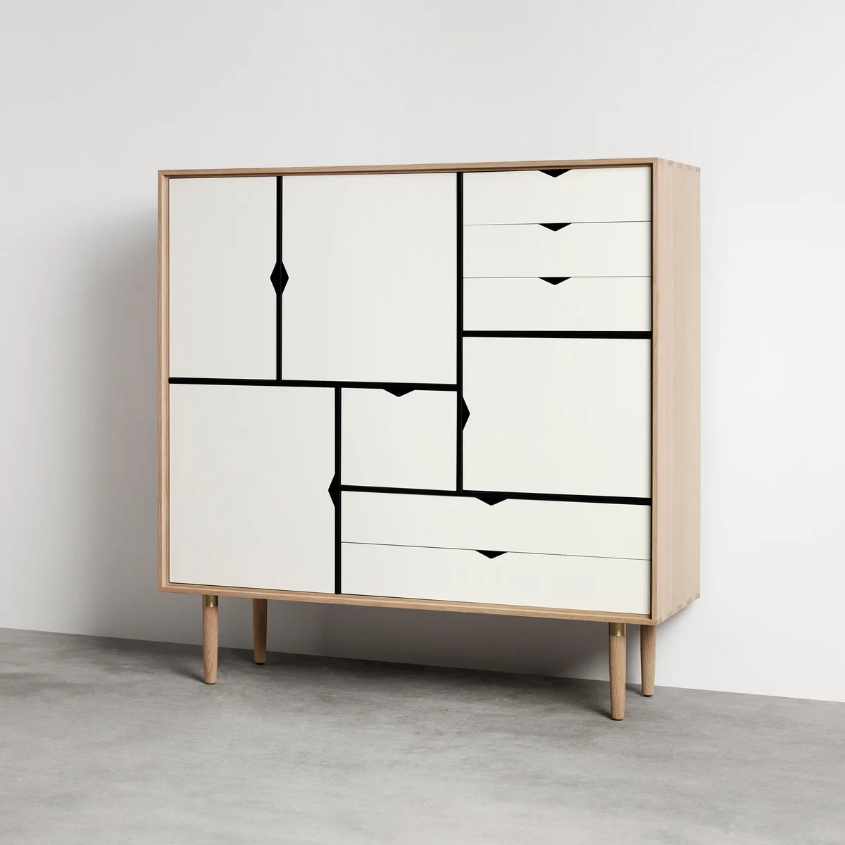 S3 is gemaakt van massief eikenhout in geoliede, gezeepte of zwarte lak of massief geolied notenhout met pengatverbindingen en heeft gedraaide poten met messing afwerking. De monochrome versie van S3 heeft ladefronten en deuren in een effen wit. S3 Er is echter ook een meerkleurige versie. De fronten van de meerkleurige versie zijn in zilver, beige en metallic grijs. De ruggen en tussenschotten zijn in elke versie zwart.