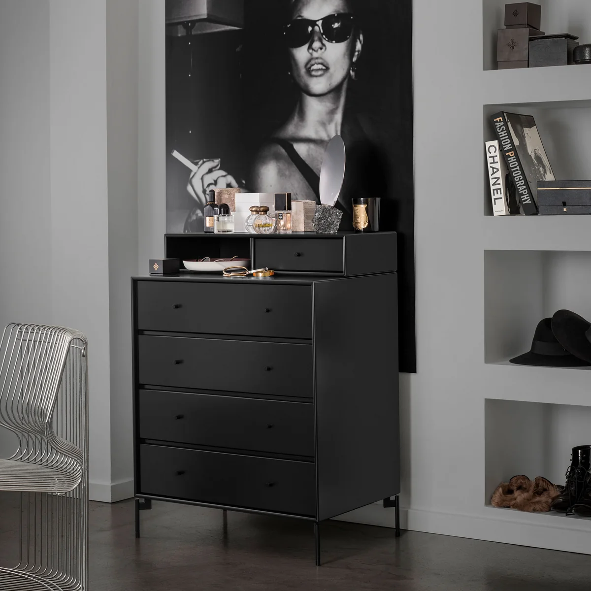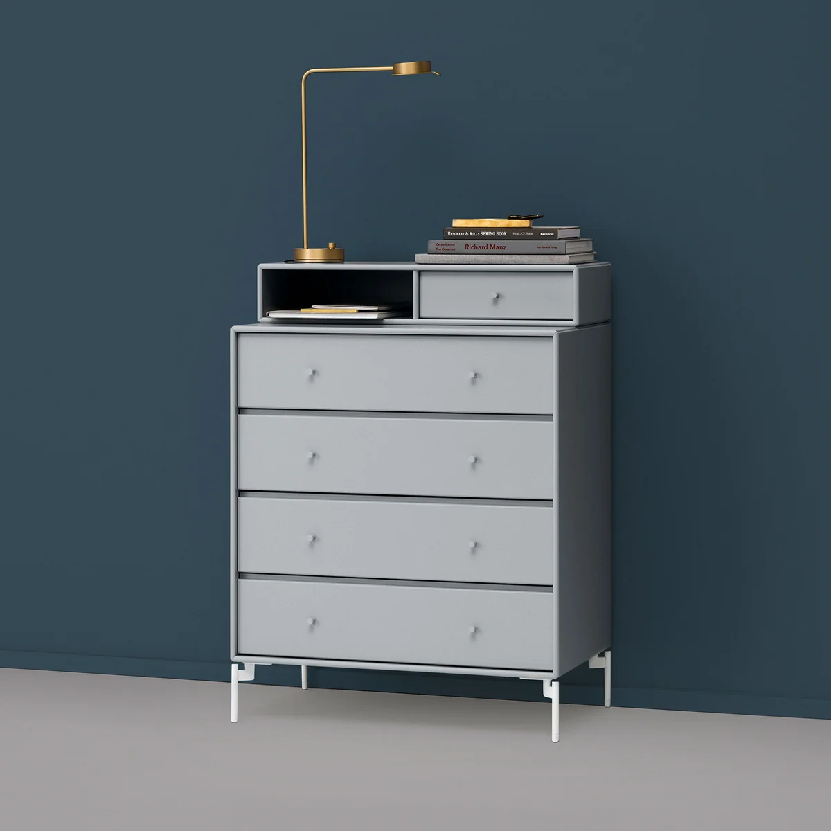 De ladekast Keep van Montana is een klassieke ladekast voor juwelen en kleding, die werd ontworpen door Peter J. Lassen. De commode met een hoogte van ca. 95 cm staat mooi in de slaapkamer, in de woonkamer of in de gang. Hij biedt voldoende ruimte voor bovenstukken, broeken, handdoeken, juwelen en nog veel meer in vier grote laden, een kleine lade op het schap en een klein open vak.