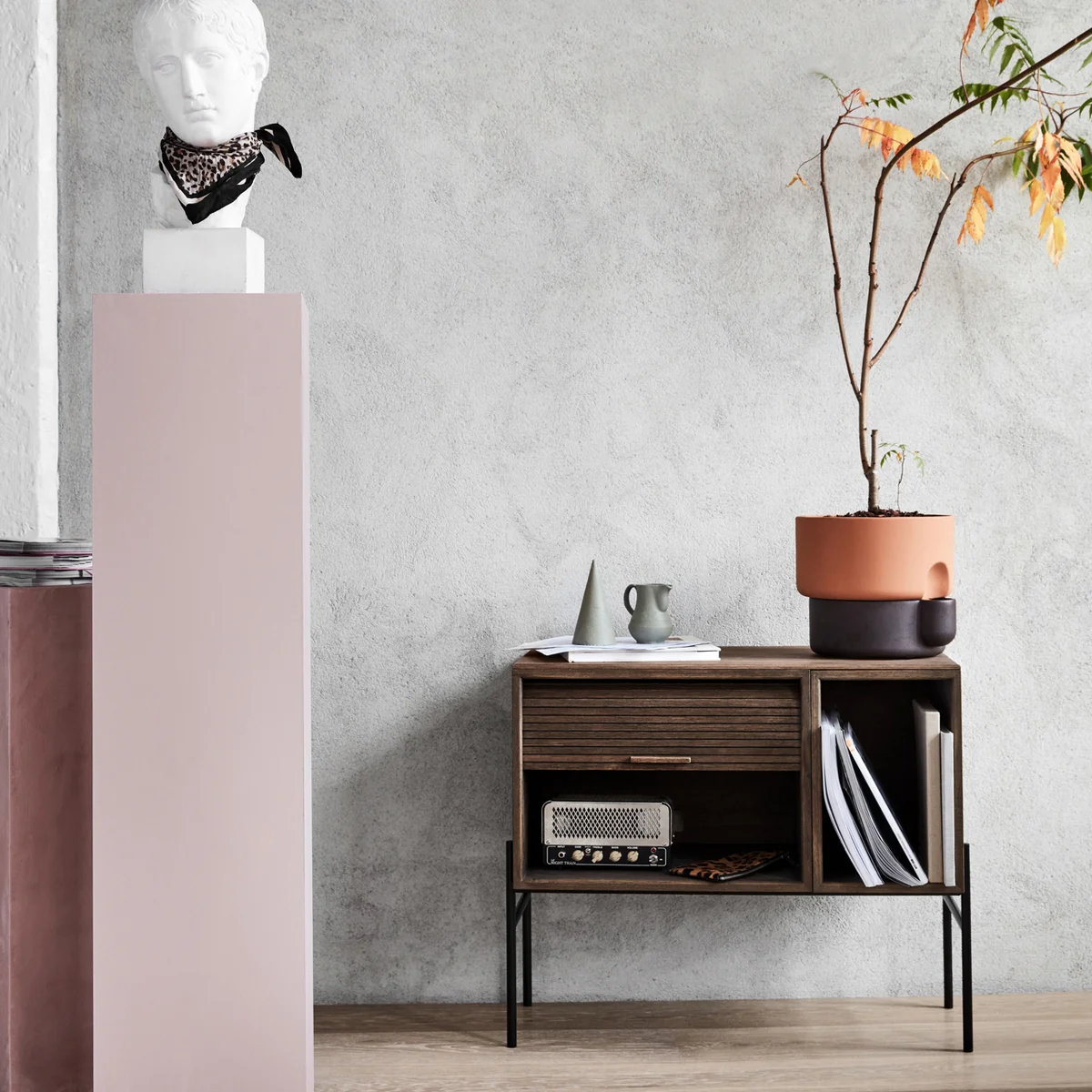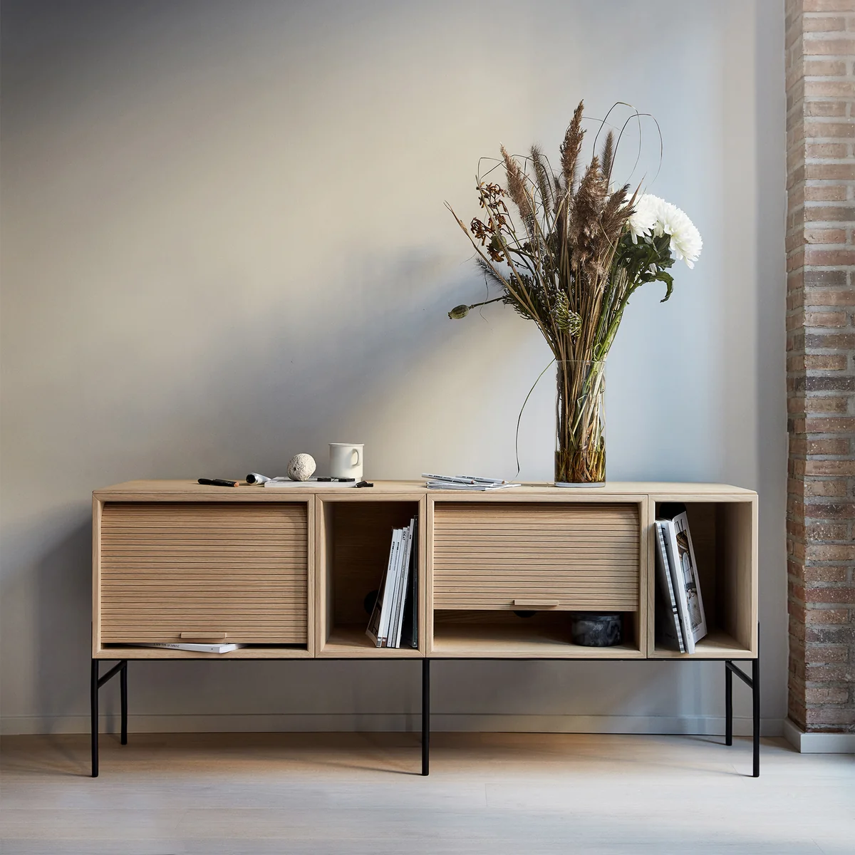 De Hifive-kast met zijn praktische roldeuren ziet er niet alleen goed uit, maar verbergt ook lelijke hifi-apparatuur, ontvangers - als de Hifive als tv-meubel wordt gebruikt - of dossiers. De elementen zijn verbonden met een houten paneel op het oppervlak en troont op een slank metalen frame, dat het dressoir elegantie en lichtheid verleent.