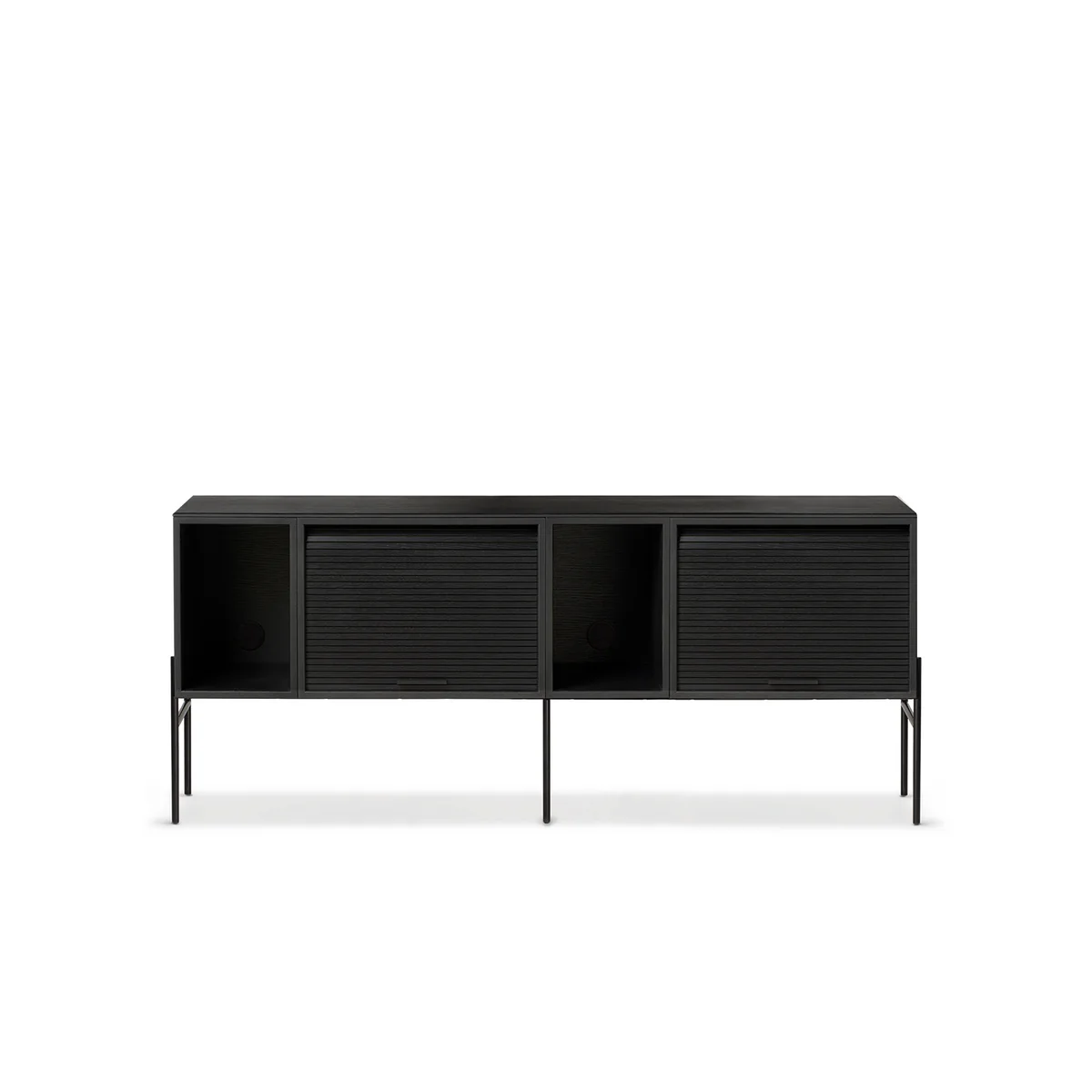 De Hifive-kast met zijn praktische roldeuren ziet er niet alleen goed uit, maar verbergt ook lelijke hifi-apparatuur, ontvangers - als de Hifive als tv-meubel wordt gebruikt - of dossiers. De elementen zijn verbonden met een houten paneel op het oppervlak en troont op een slank metalen frame, dat het dressoir elegantie en lichtheid verleent.