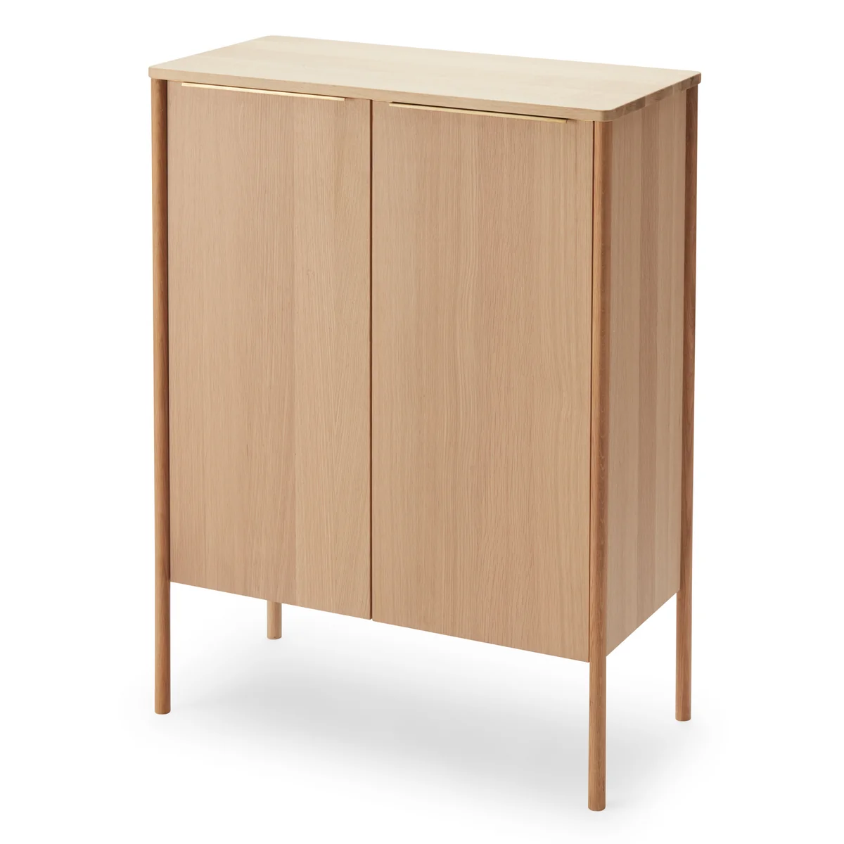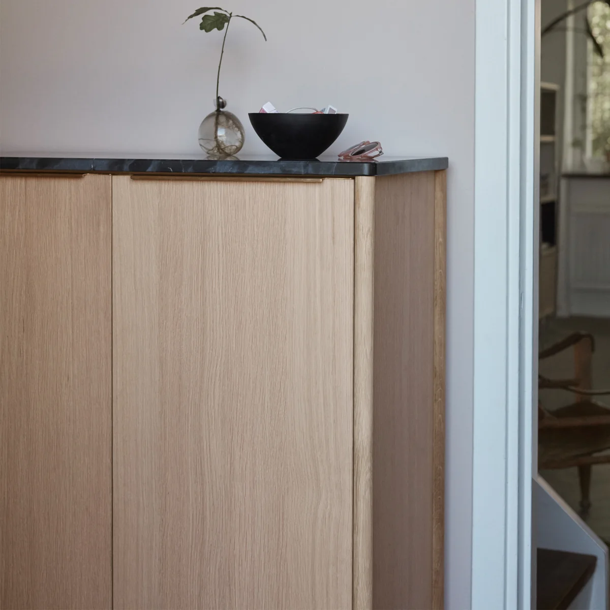 Jut High Cabinet is gemaakt van gedeeltelijk FSC®-gecertificeerd, geolied eikenhout met messing handgrepen. Hij is ook verkrijgbaar in een uiterst edele versie met een zwart marmeren oppervlak.