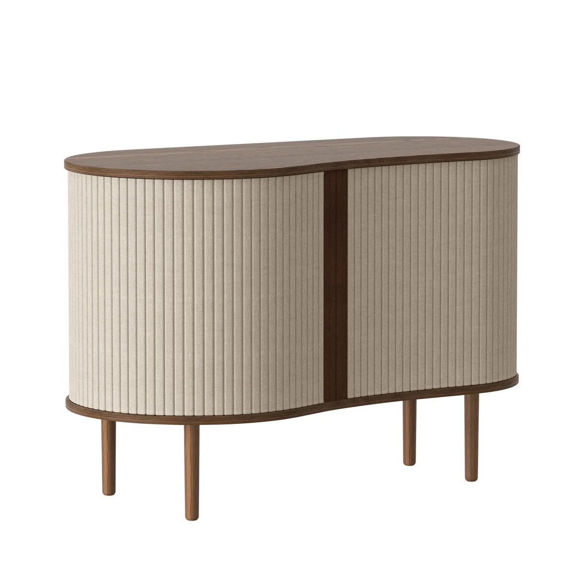 De harmonieuze hoeken van de door Jonas Søndergaard ontworpen ladekast ronden het profiel af, waardoor hij zelfs in een kamer met beperkte ruimte goed past. De rolschuifdeuren hebben een bekleding van textiel, die Audacious een zacht gevoel geeft.