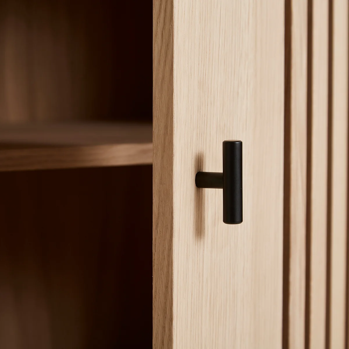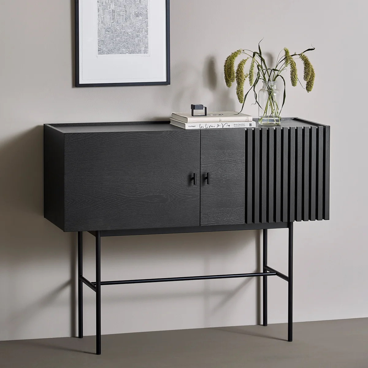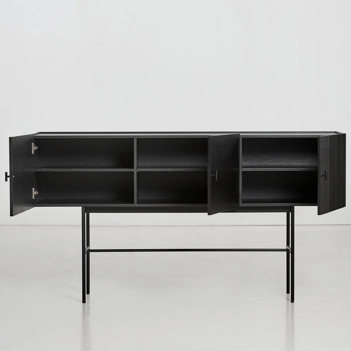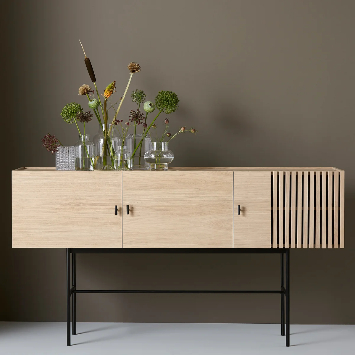 Het dressoir wordt een discrete blikvanger in de kamer en bergt tegelijkertijd veel verschillende dingen op. Vazen, boeken en andere decoratieve elementen kunnen stijlvol op het dressoir worden gepresenteerd. De Array Sideboard van eikenhout en gelakt staal is verkrijgbaar in verschillende maten en kleuren.