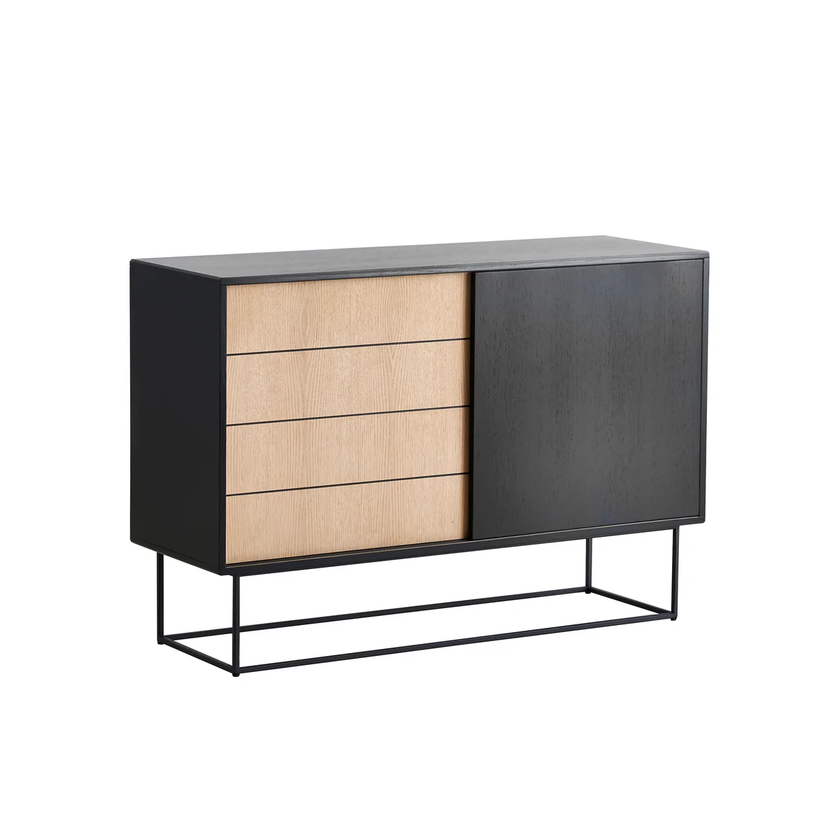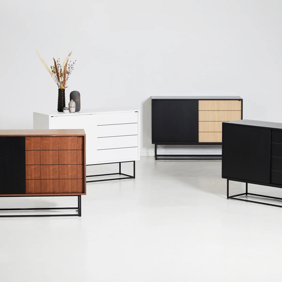 Zowel alleen als in een groep overtuigt het dressoir - van ontwerpstudio Røpke - deels door zijn schuifdeuren, waardoor het zo weinig mogelijk ruimte inneemt. Het geometrische silhouet van hout wordt ondersteund door een filigraan metalen onderstel, dat het dressoir, ondanks zijn kubistische vorm, een filigrane charme verleent.